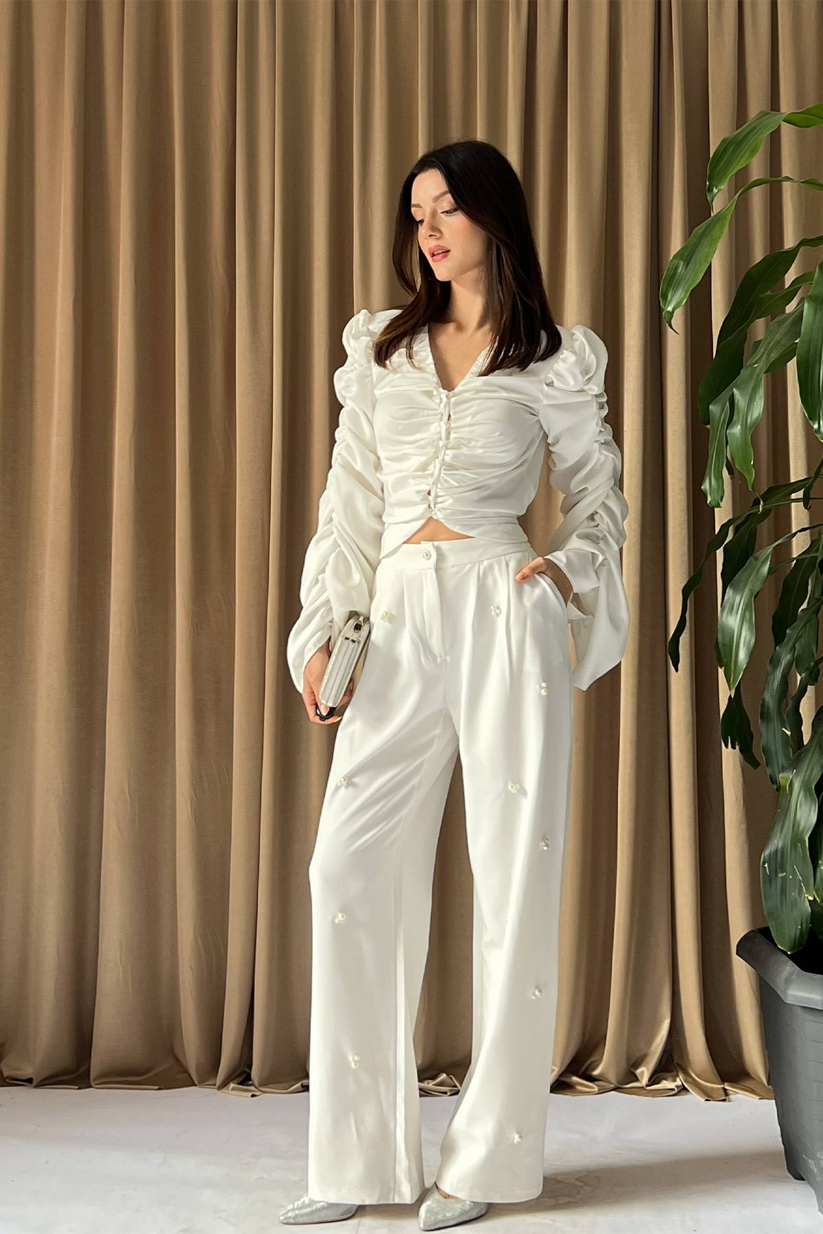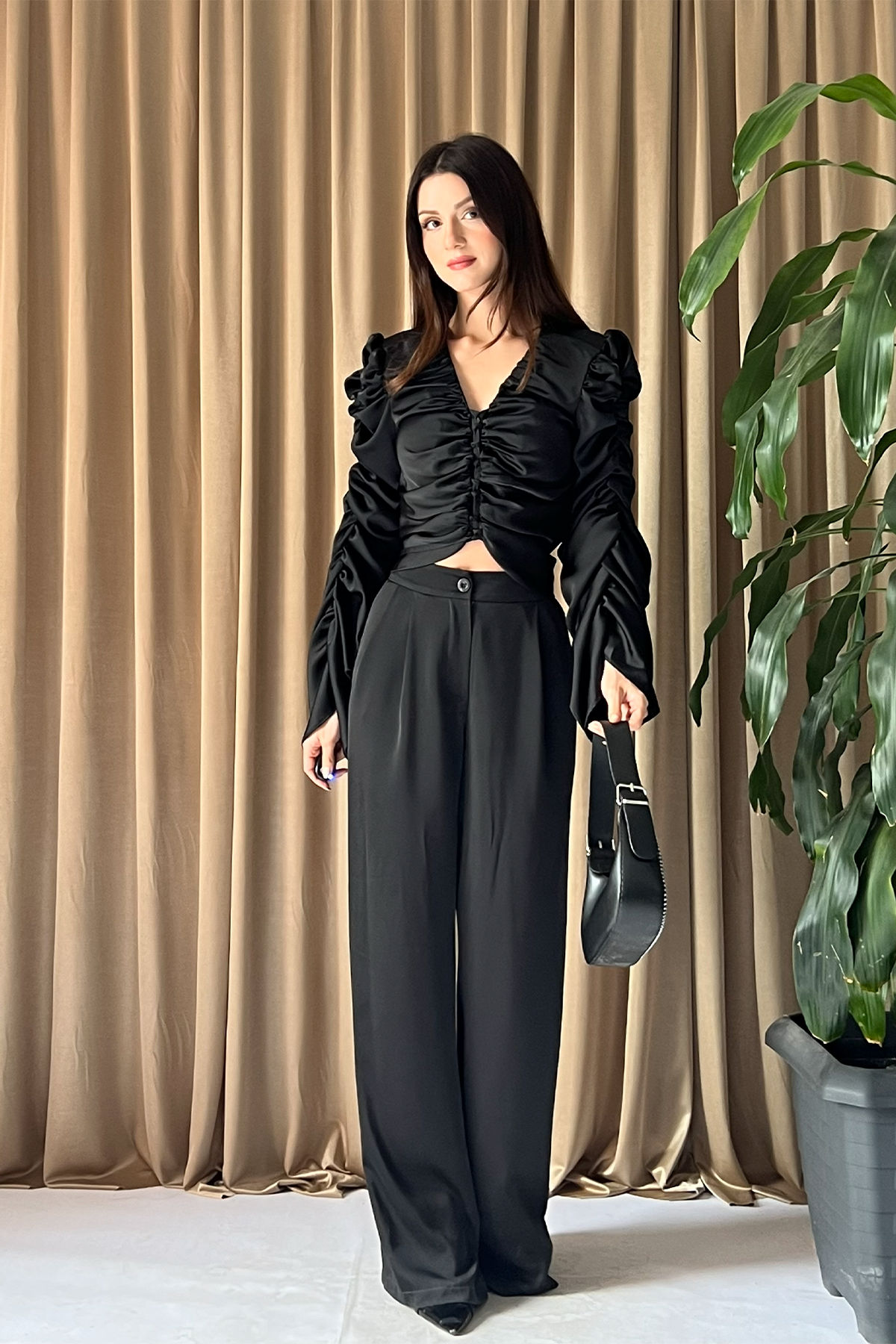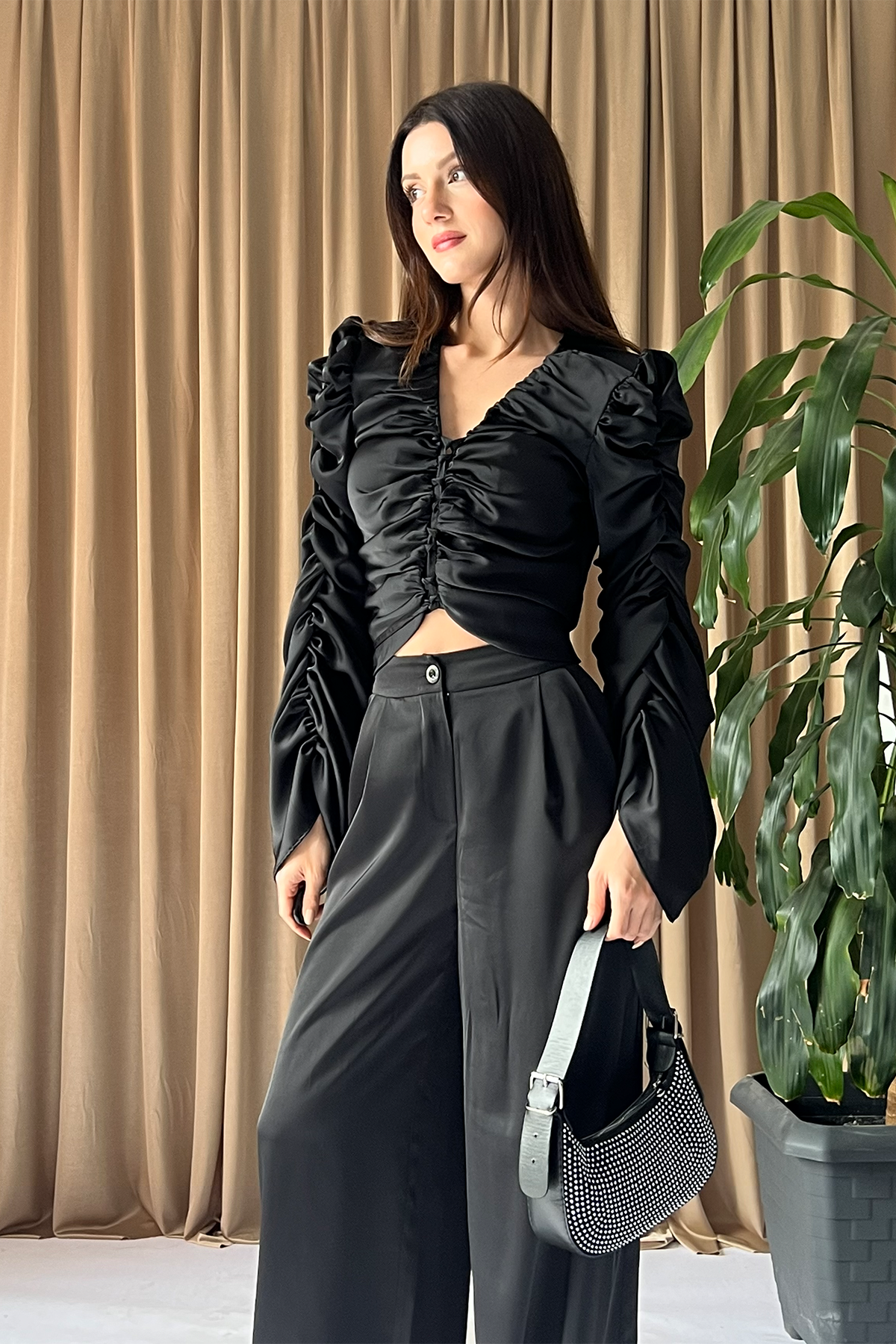 Büzgü Detaylı Drapeli Saten Uzun Kollu Kadın Crop Bluz