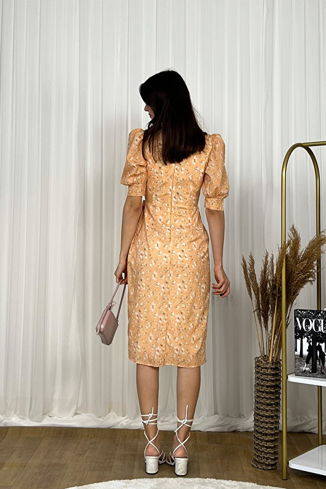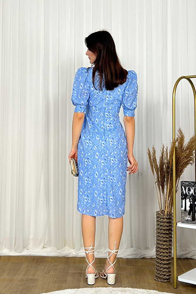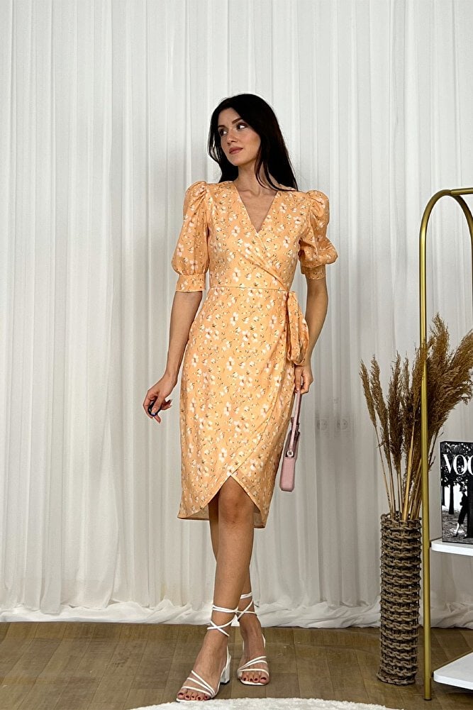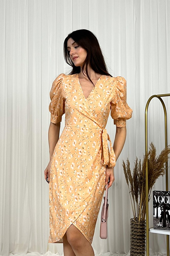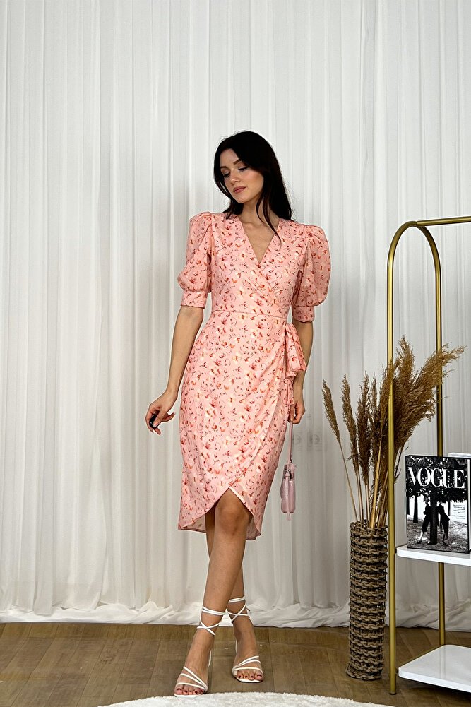 Kruvaze kesimi ve V yaka tasarımıyla feminen bir şıklık sunan bu midi boy elbise, balon kol detaylarıyla modern bir dokunuş kazanır.; Belden bağlamalı yapısı vücut hatlarını zarifçe vurgularken, hafif ve akıcı kumaşı gün boyu konfor sağlar.; Günlük kullanımdan özel davetlere kadar geniş bir kullanım alanı sunan bu şık elbise, zamansız tasarımıyla gardırobunuzun kurtarıcı parçalarından biri olmaya adaydır.;