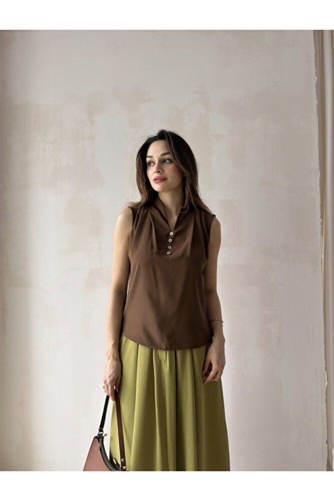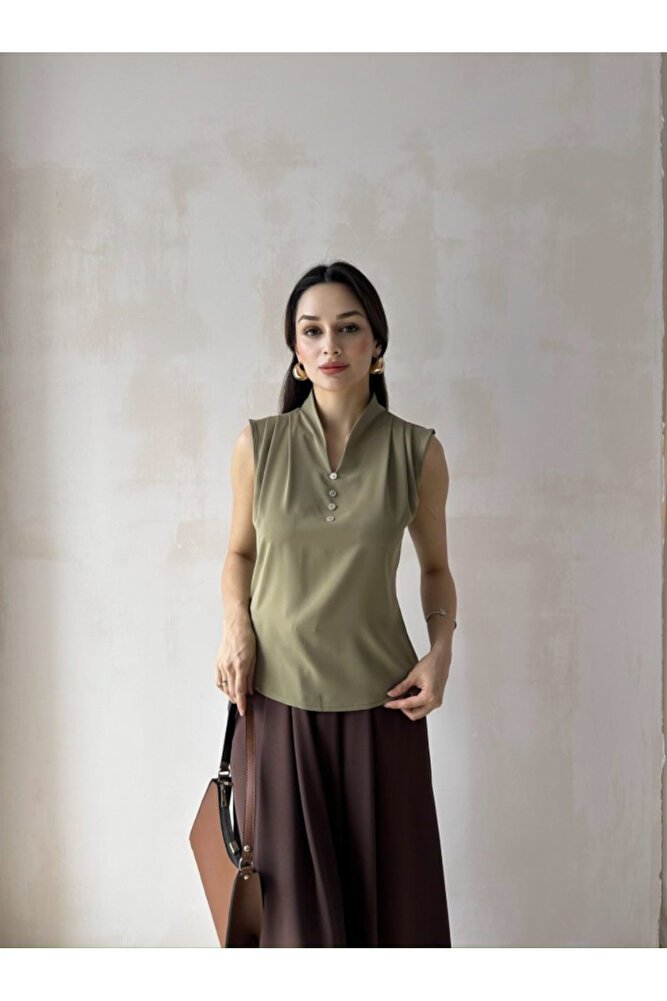- Standart boy ve A-Form Fit kalıbı ile her vücut tipine uyum sağlar.; - Kemersiz tasarımı, rahat bir kullanım sunar ve şıklığı sade bir şekilde yansıtır.; - Kaplı yapısı sayesinde göğüs bölgesinde ekstra destek ve konfor sağlar.; - Kolsuz tasarımı ile yaz aylarında serinlik ve hareket özgürlüğü sunar.; - Düz deseni ve haki rengiyle zamansız bir şıklık yaratır.; - İç göstermeyen kumaşı ile rahatlıkla günlük kullanım için idealdir.; - A-line silueti sayesinde feminen bir görünüm kazandırır.; - Casual/Günlük ortamlar için uygun tasarım detaylarıyla dikkat çeker.; - Pamuk materyali sayesinde nefes alabilen yapıda olup, gün boyu konfor sunar.; - Dokuma tipi krep kumaşı, dayanıklılığı artırarak uzun süreli kullanım imkanı verir.; - V yaka detayı ile dekolte bölgesine zarif bir dokunuş katarken, astarsız olması hafiflik sağlar.; - TR menşei garantisiyle üretilmiştir; kaliteyi yakından tanıyabilirsiniz.