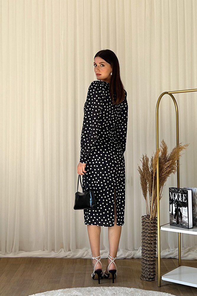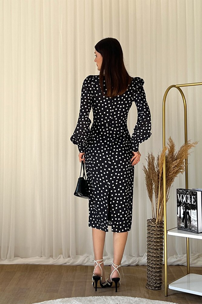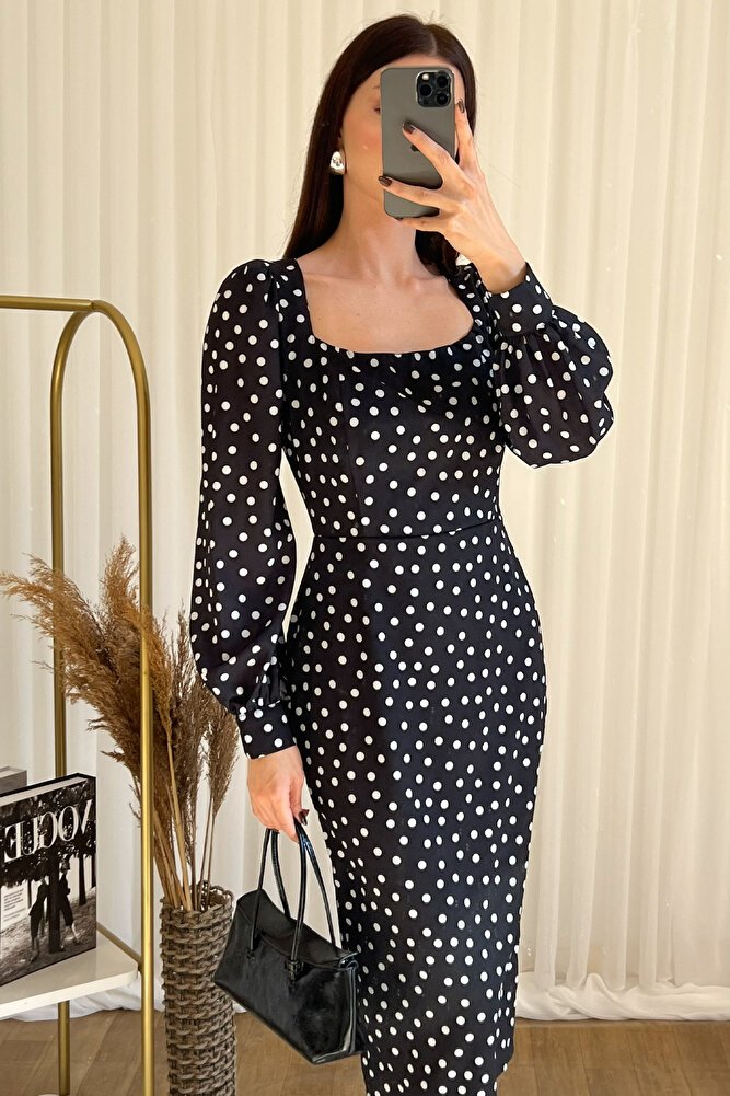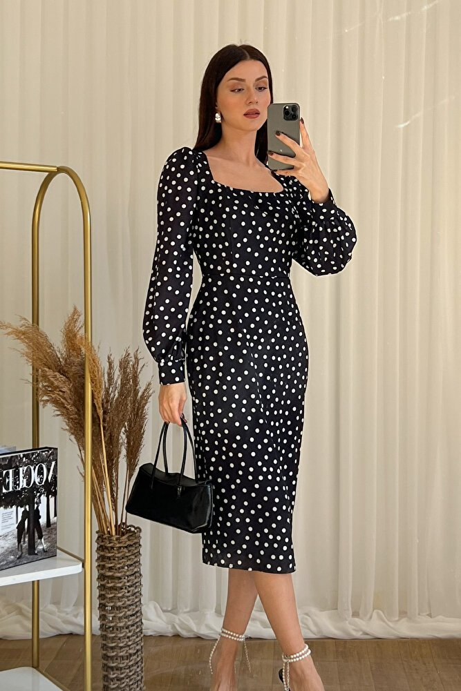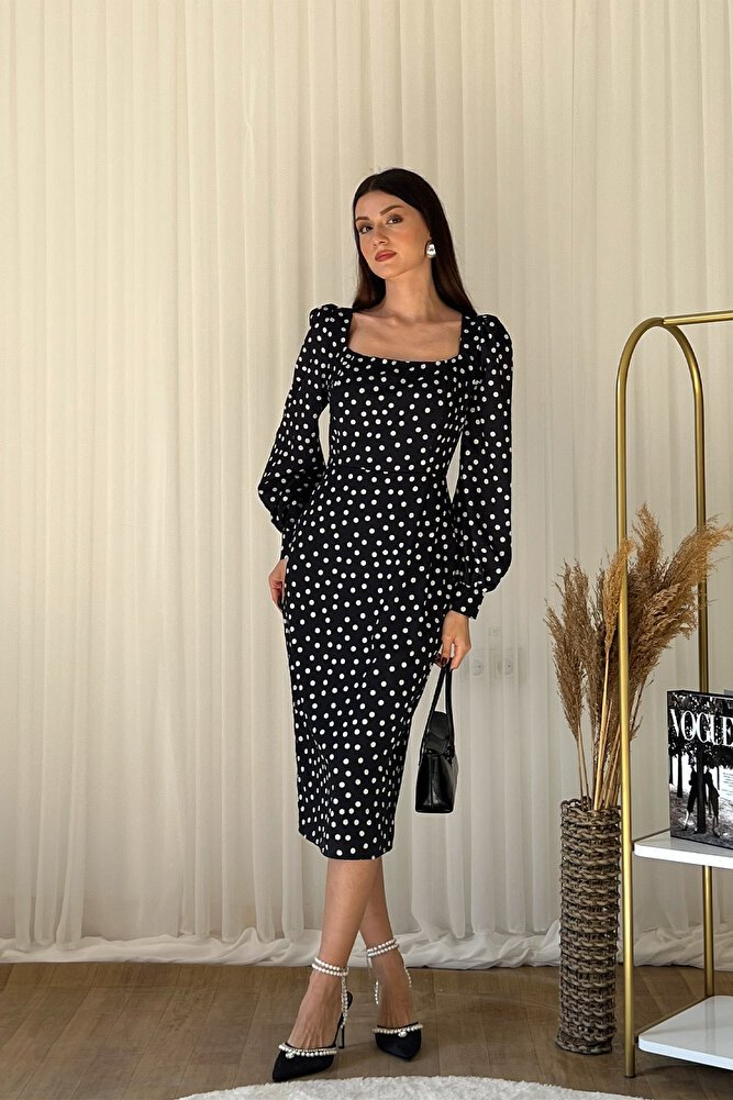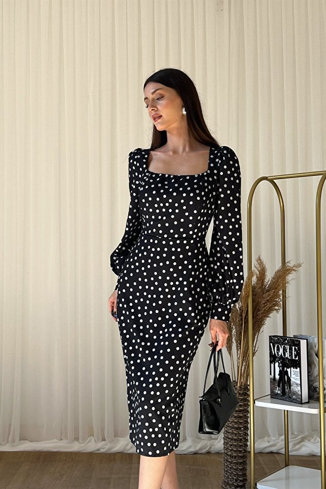 Zamansız puantiye deseni ve modern kare yaka tasarımıyla öne çıkan midi elbise, şıklığı ve konforu bir arada sunar.; Belden oturtmalı kesimi sayesinde vücut hatlarını zarifçe vurgularken uzun kollu yapısı ile mevsim geçişlerinde ve serin havalarda ideal kullanım sağlar.; Akıcı ve hafif kumaşı gün boyu rahatlık sunar, diz altı midi boyu ise hem günlük kombinlerde hem de davet, ofis ve özel günlerde şık bir görünüm kazandırır.; Vintage esintili tasarımıyla topuklu ayakkabılarla klasik, düz ayakkabılarla ise modern bir stil oluşturmanıza yardımcı olan bu kare yaka puantiyeli elbise, gardırobunuzun vazgeçilmez parçalarından biri olmaya adaydır.;