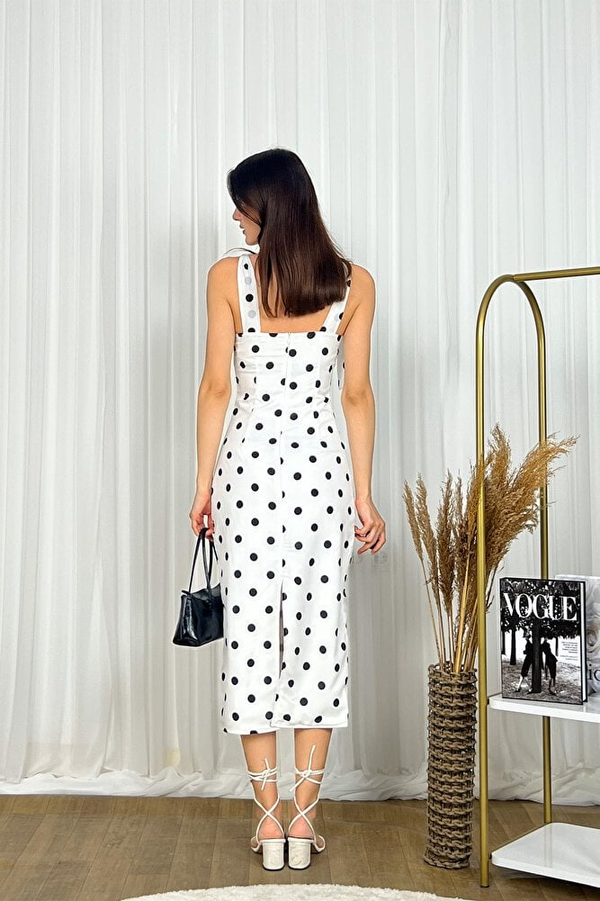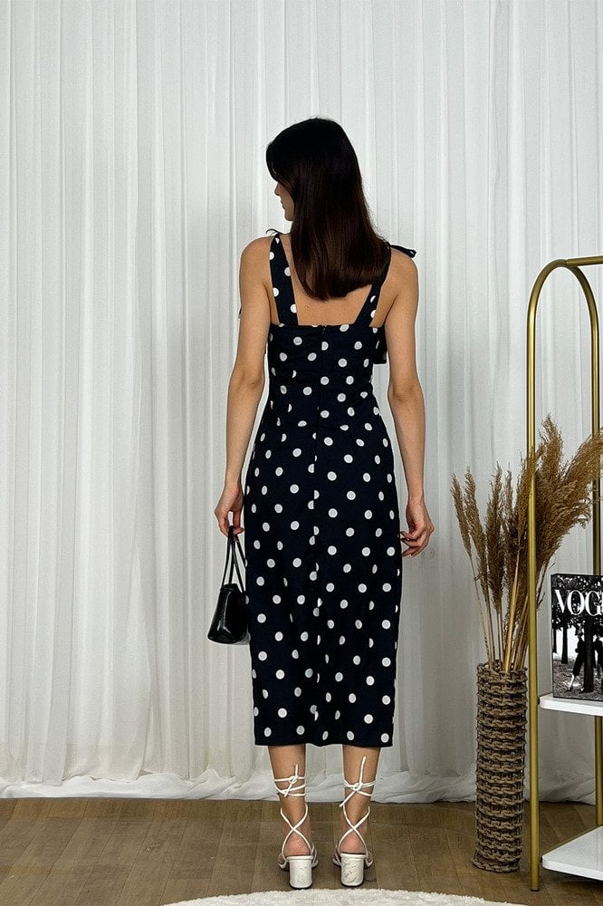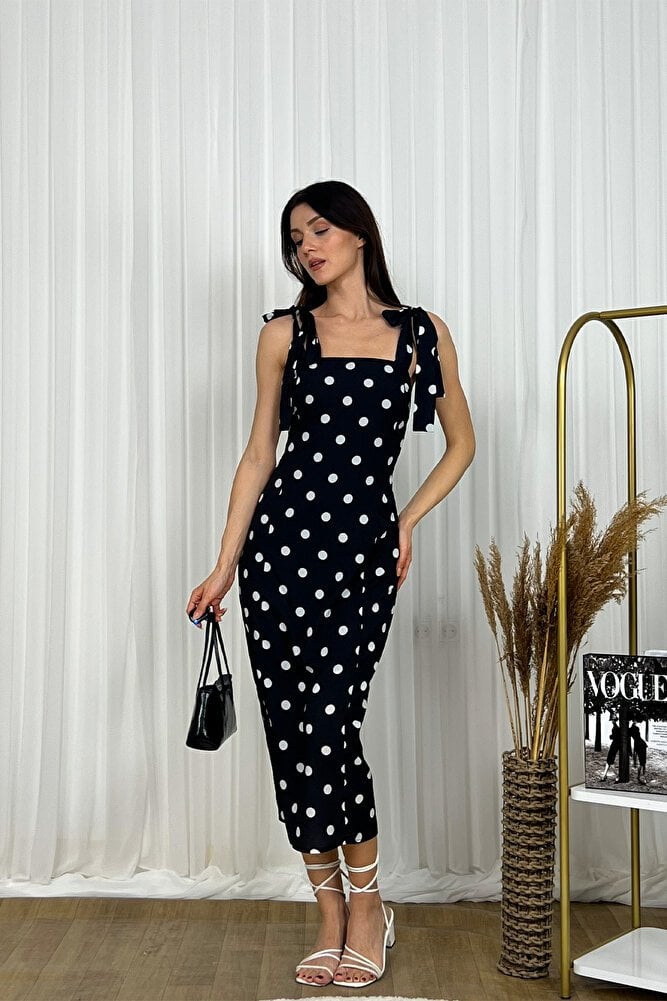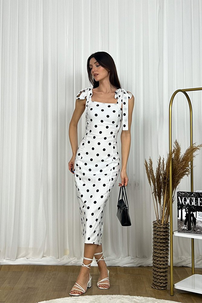 Zamansız puantiye deseni ve omuzdan bağlamalı askı detayıyla öne çıkan midi elbise, feminen ve şık bir stil sunar.; Kare yaka formu dekolteyi zarif şekilde vurgularken, dar fit silüeti vücut hatlarını kusursuzca sarar.; Hafif ve akıcı dokuma kumaşı sayesinde gün boyu konfor sağlarken, kolsuz yapısı ilkbahar ve yaz aylarında ferah bir kullanım sunar.; Günlük şıklıkta sandalet ve sneakerlarla, akşam kombinlerinde ise topuklu ayakkabı ve minimal aksesuarlarla kolayca tamamlanabilen bu elbise; davetlerden şehir stiline kadar geniş bir kullanım alanı sunan gardırop kurtarıcısıdır.;