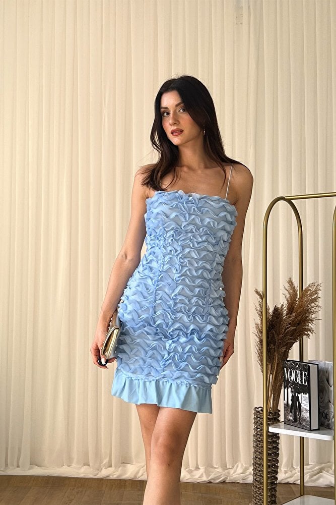 Askılı tasarımı ile zarif ve feminen bir görünüm sunan mini abiye elbise.;