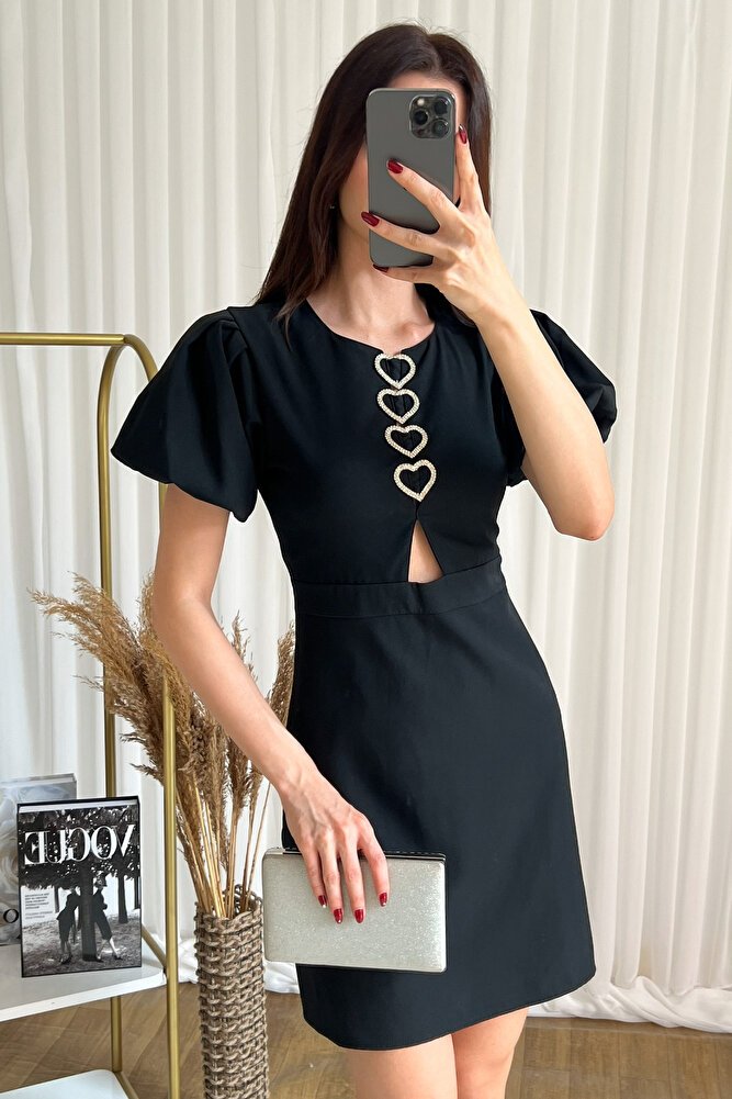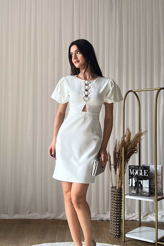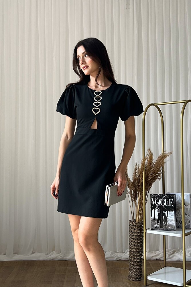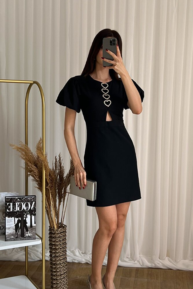 Kalp formunda metal aksesuar detayıyla öne çıkan kısa kollu mini elbise, feminen ve modern tasarımıyla şık kombinlerin vazgeçilmezi olur.; Yuvarlak yaka formu ve göğüs dekoltesi elbiseye zarif bir hava katarken, dar fit silüeti vücut hatlarını kusursuzca sarar.; Esnek örme kumaşı sayesinde gün boyu konfor sunan bu model, mini boyu ile dinamik bir görünüm sağlar.; İlkbahar ve yaz sezonunda davetlerden akşam buluşmalarına kadar pek çok ortamda topuklu ayakkabı ve minimal aksesuarlarla tamamlanarak etkileyici bir stil oluşturur.; Zamansız duruşu ve dikkat çekici detayıyla gardırobunuzun favori parçalarından biri olmaya adaydır.;