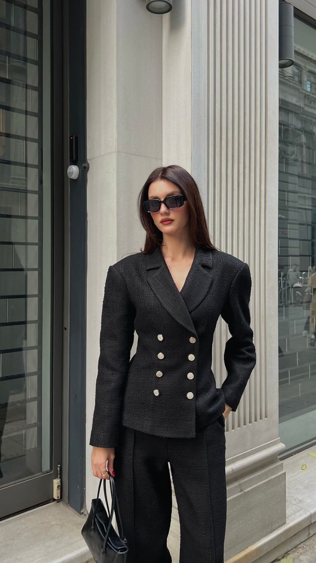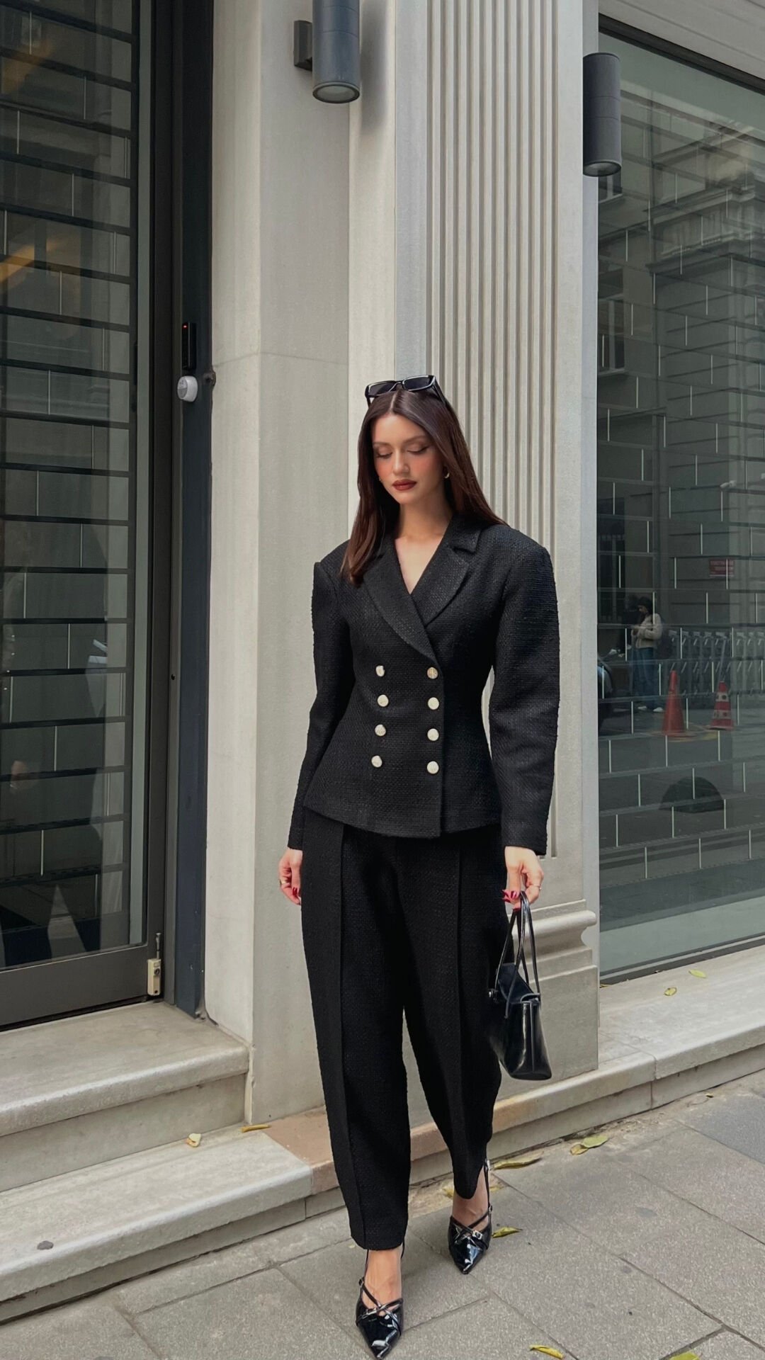 Bu kadın siyah kumaş takım, tok dokulu kumaşı ve inci görünümlü düğmeleriyle modern şehir şıklığını yansıtır.
