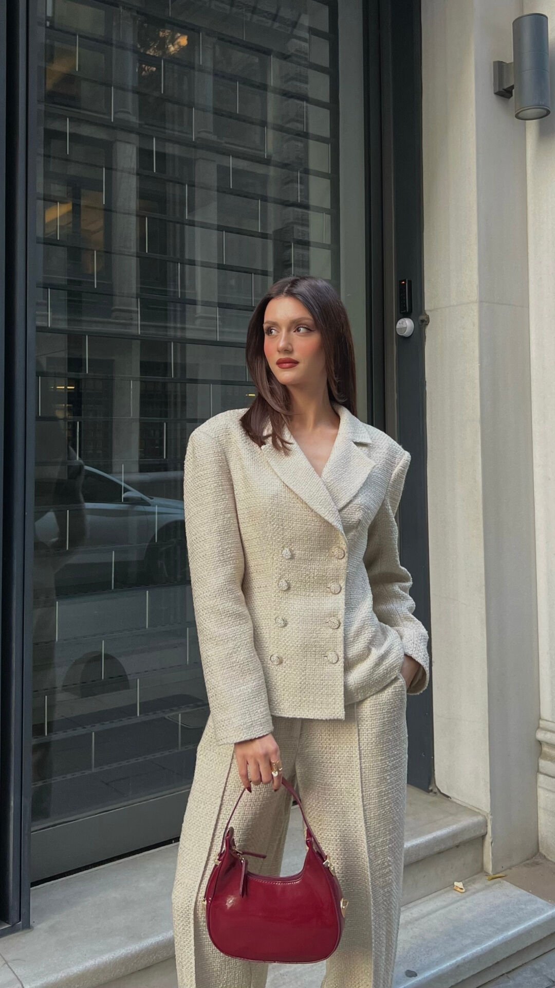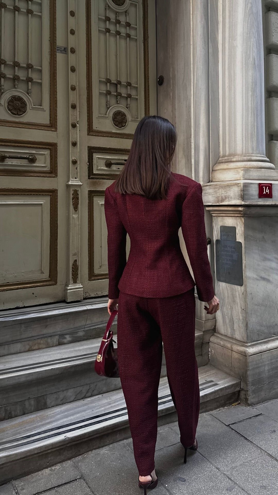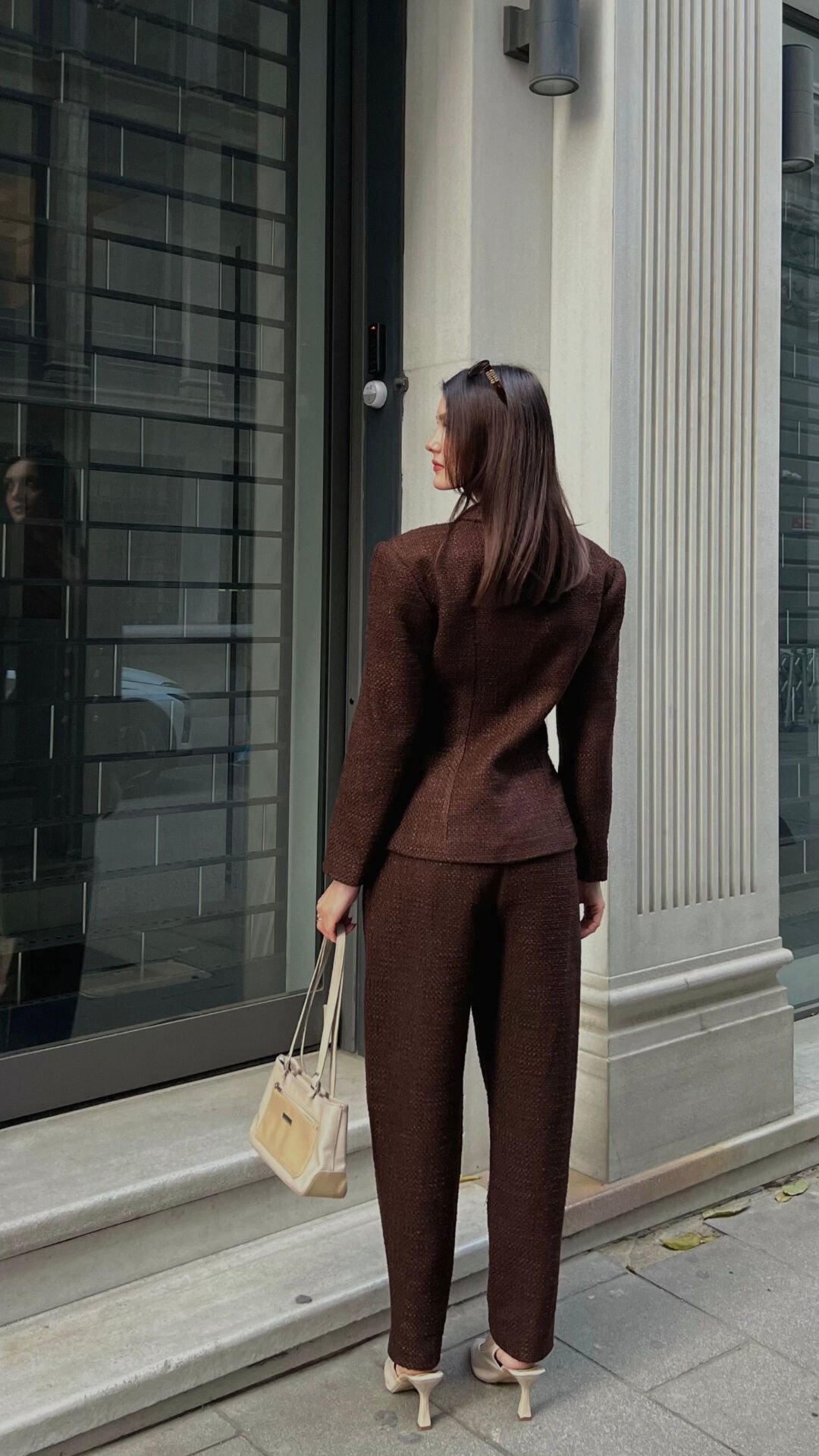 Bel oturtmalı çift sıra düğmeli blazer ceket, vücut formunu zarifçe vurgularken, düz kesim pantolon konforu ve şıklığı bir araya getirir.