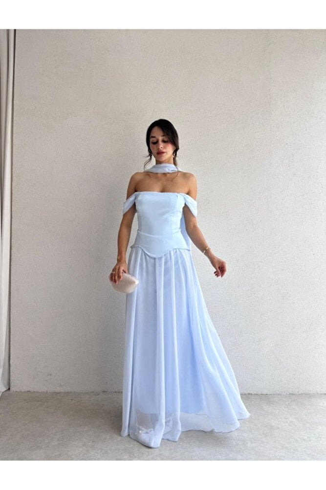 Mavi Kruvaze Yaka Drapeli Saten Abiye Elbise – Omzu Açık 5113