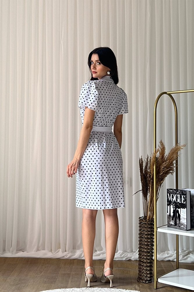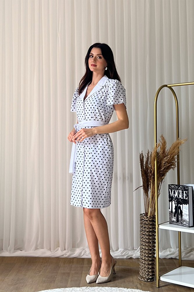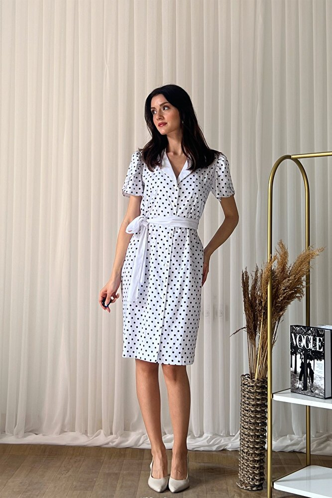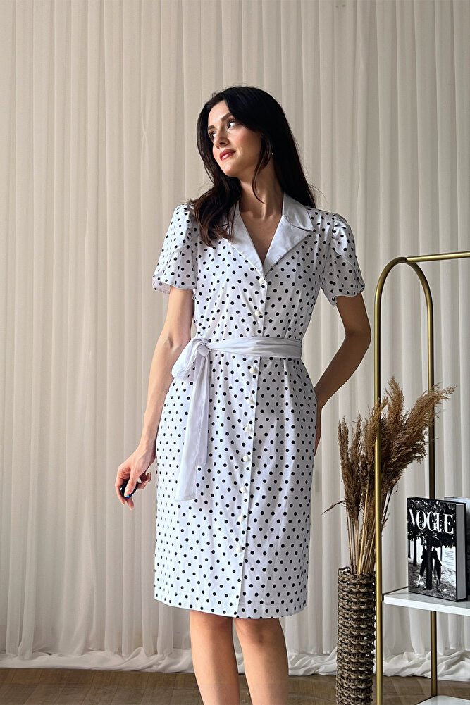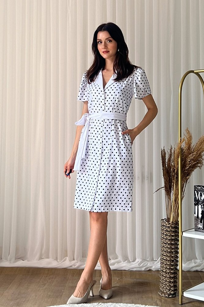 Puantiye desenli tasarımı, V yaka formu ve belden kuşak detayıyla feminen bir şıklık sunan bu midi boy elbise, A kesim silueti sayesinde rahat ve zarif bir duruş sağlar.; Ön düğme kapaması pratik kullanım sunarken, hafif ve akıcı kumaş yapısı gün boyu konfor sağlar.; Günlük kombinlerden özel buluşmalara kadar geniş bir kullanım alanı sunan bu şık elbise, zamansız tasarımıyla gardırobunuzun vazgeçilmez parçalarından biri olmaya adaydır.;
