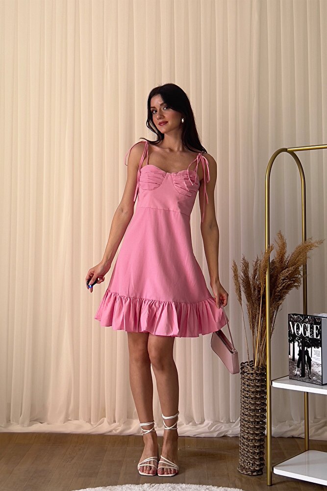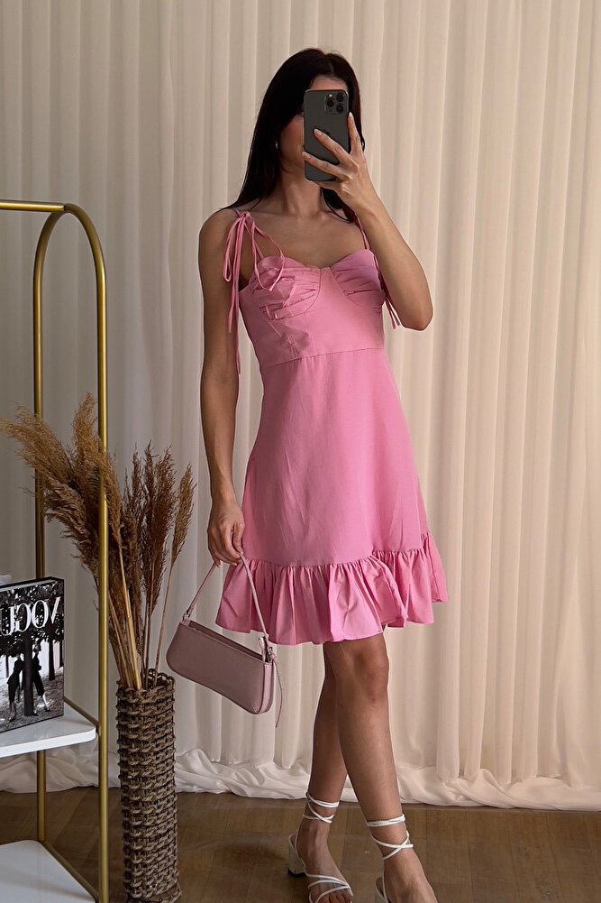 Askılı ve fırfır detaylı tasarımıyla feminen bir görünüm sunan bu mini boy elbise, A kesim formu sayesinde rahat ve zarif bir siluet oluşturur.; Hafif ve akıcı kumaş yapısı gün boyu konfor sağlarken, göğüs büzgü detayı elbiseye şık bir dokunuş katar.; Günlük kullanımdan yaz davetlerine kadar birçok ortamda kolayca tercih edilebilen bu şık elbise, modern ve rahat bir stil arayanlar için ideal bir seçenektir.;