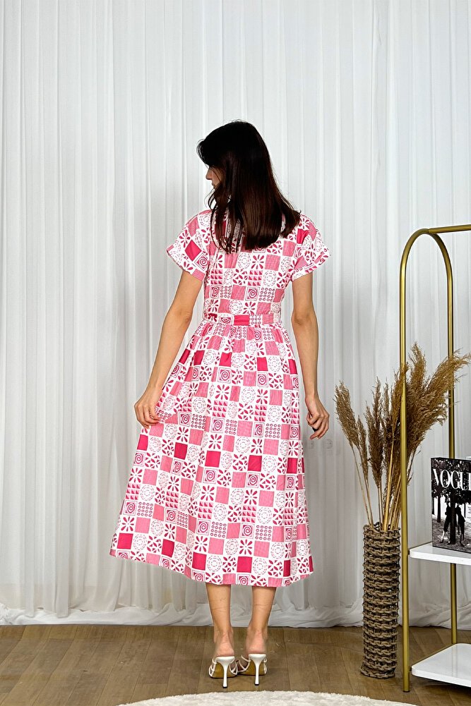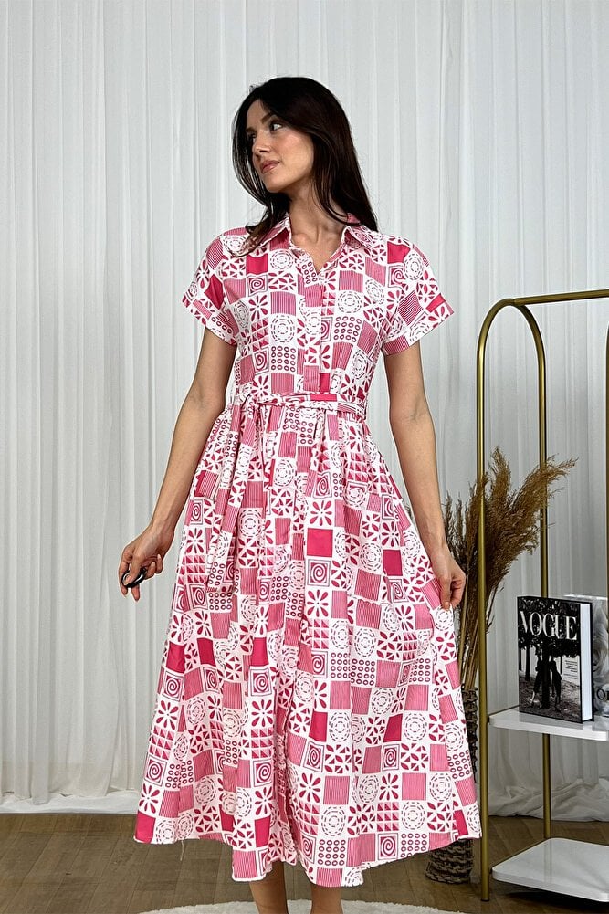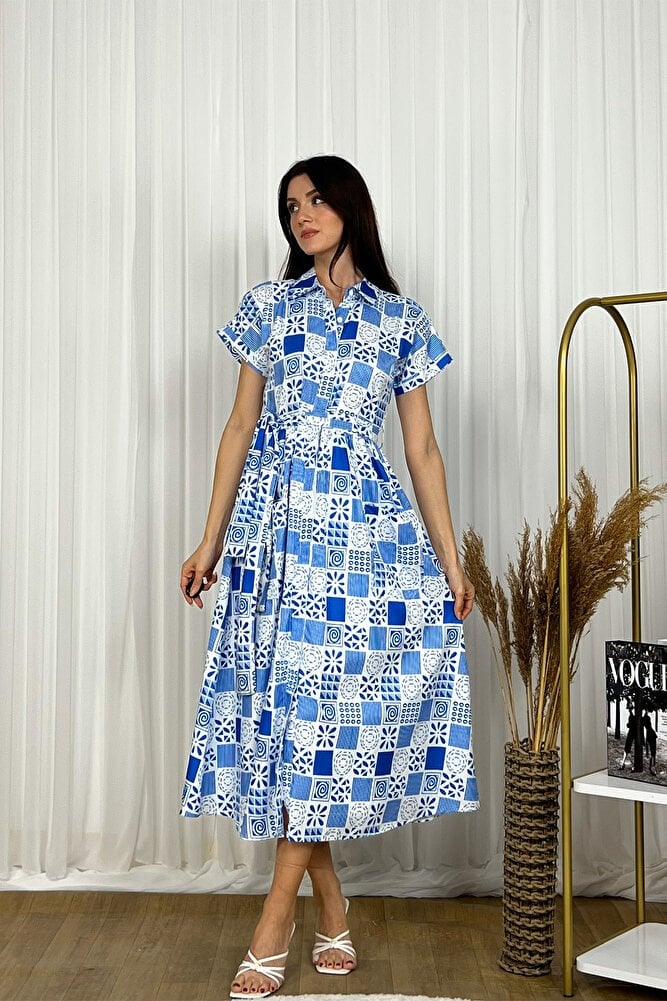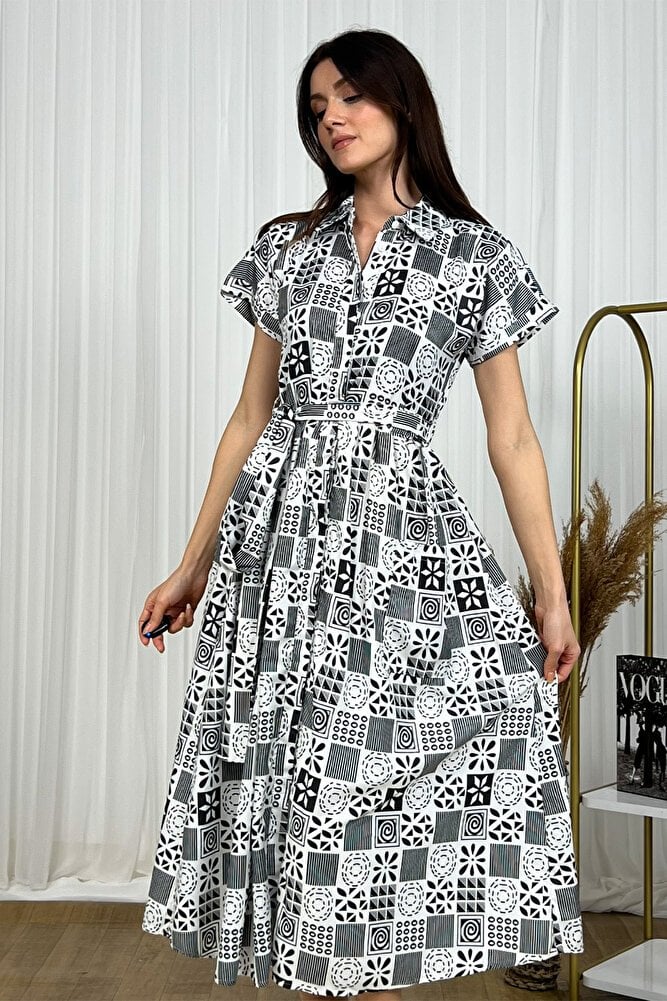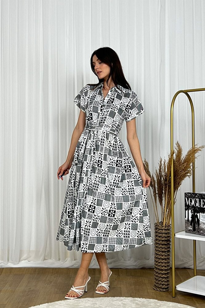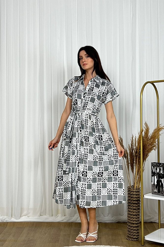 Modern ve özgün desenleriyle öne çıkan gömlek yaka kısa kollu midi boy elbise, rahat kalıbı ve belden oturtmalı formu sayesinde konforlu bir şıklık sunar.; Dokuma kumaş yapısı gün boyu ferah bir kullanım sağlarken, geometrik desenleri elbiseye dinamik ve dikkat çekici bir görünüm kazandırır.; Düğme kapamalı tasarımı pratik kullanım sunar, A kesim silueti ise vücut hatlarını dengeli şekilde vurgular.; Günlük şehir stilinden yaz kombinlerine kadar geniş bir kullanım alanına sahip olan bu elbise, zamansız ve rahat bir tarz arayanlar için ideal bir parçadır.;