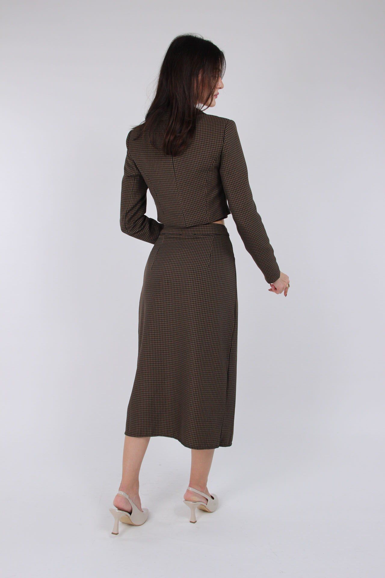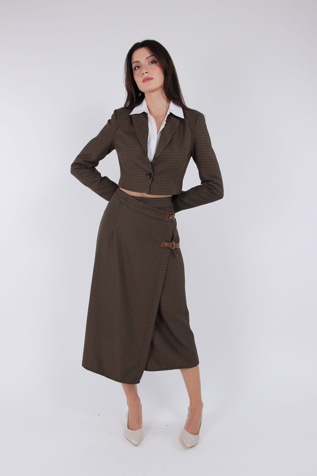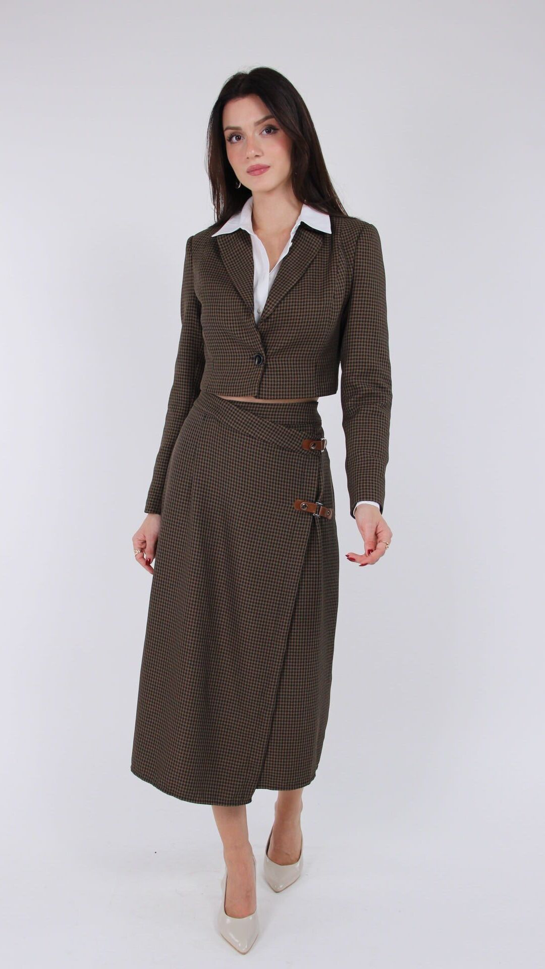 Ekose desenli ceket, yelek ve midi etek kombinasyonu, profesyonel görünümle feminen şıklığı bir araya getirir.