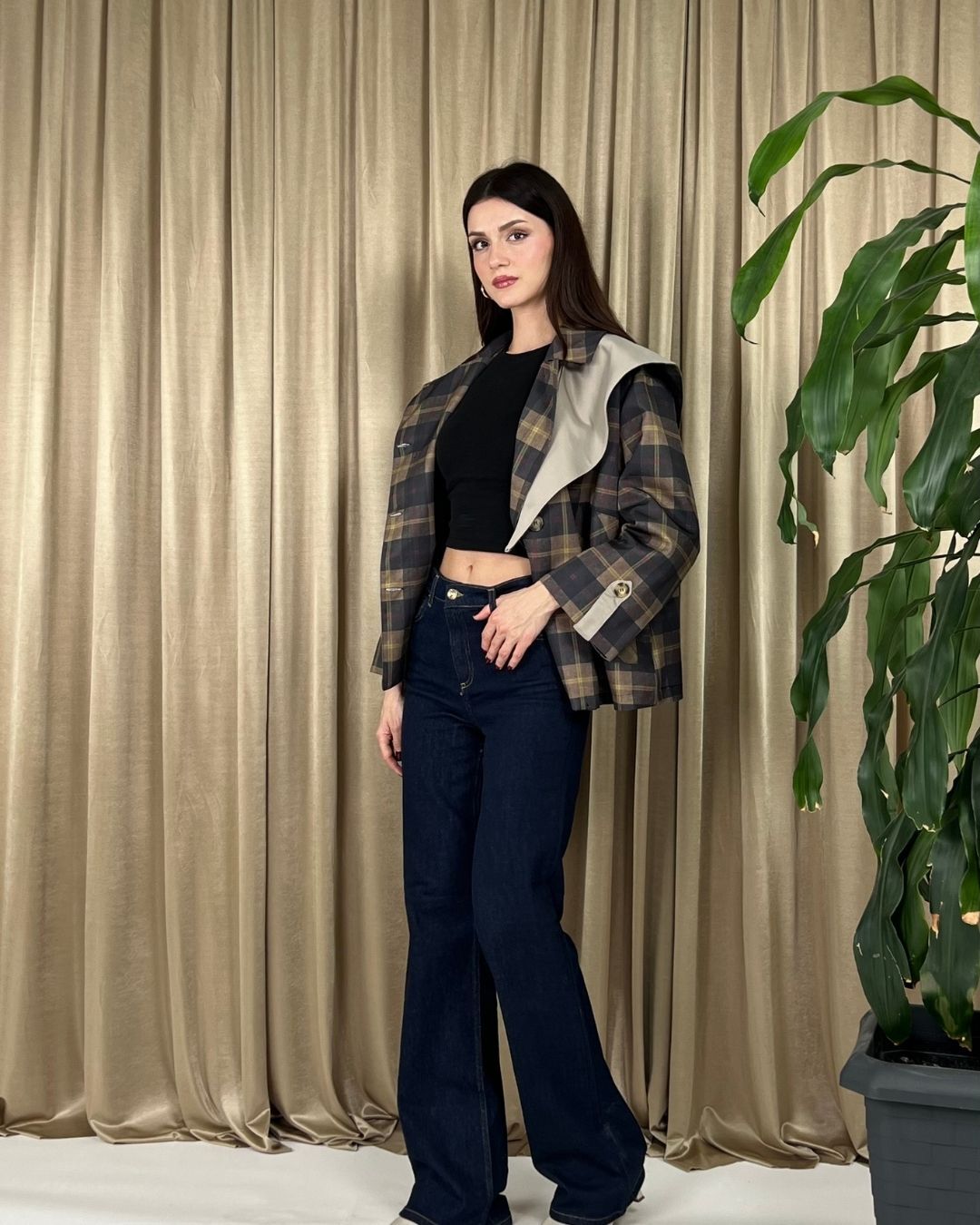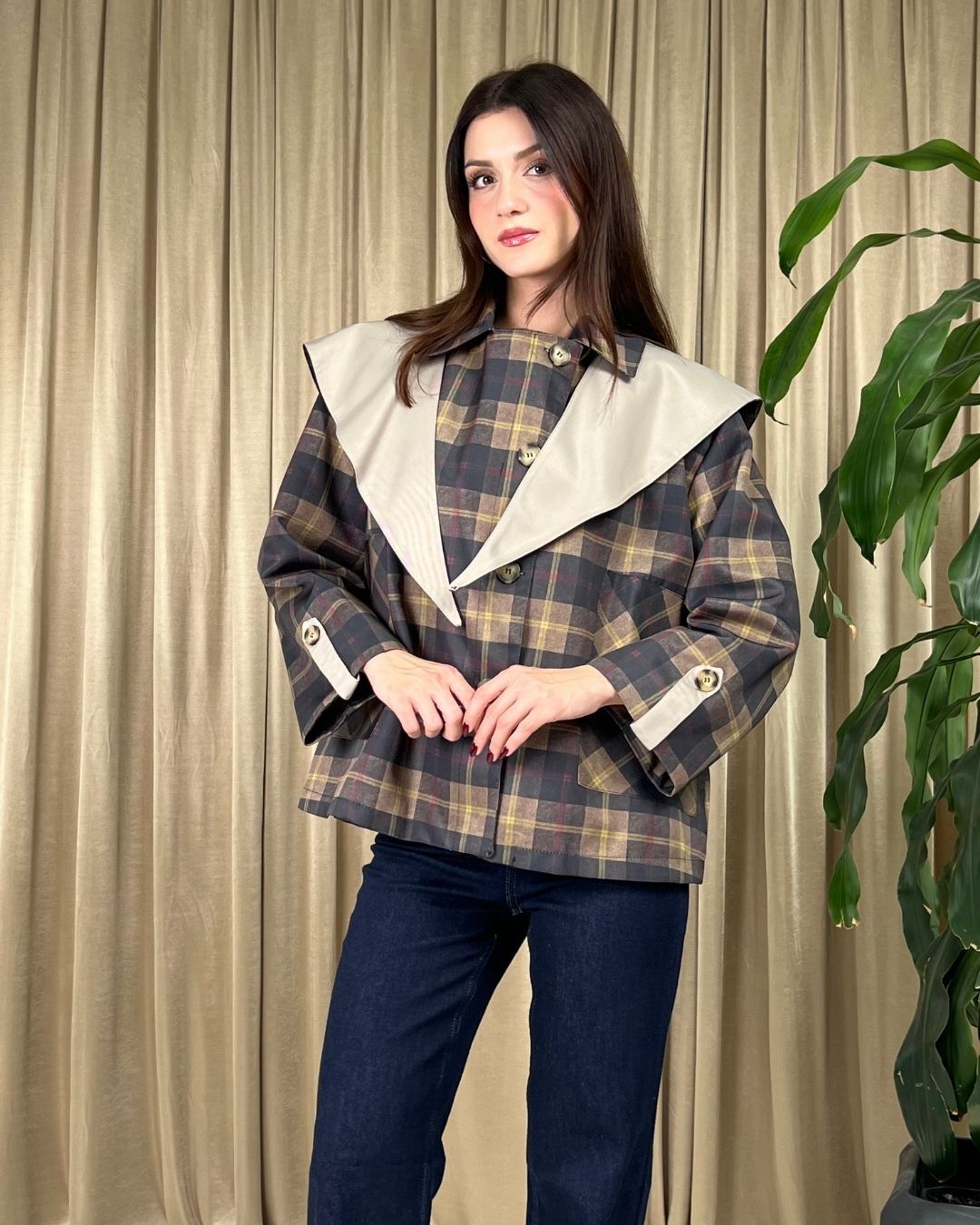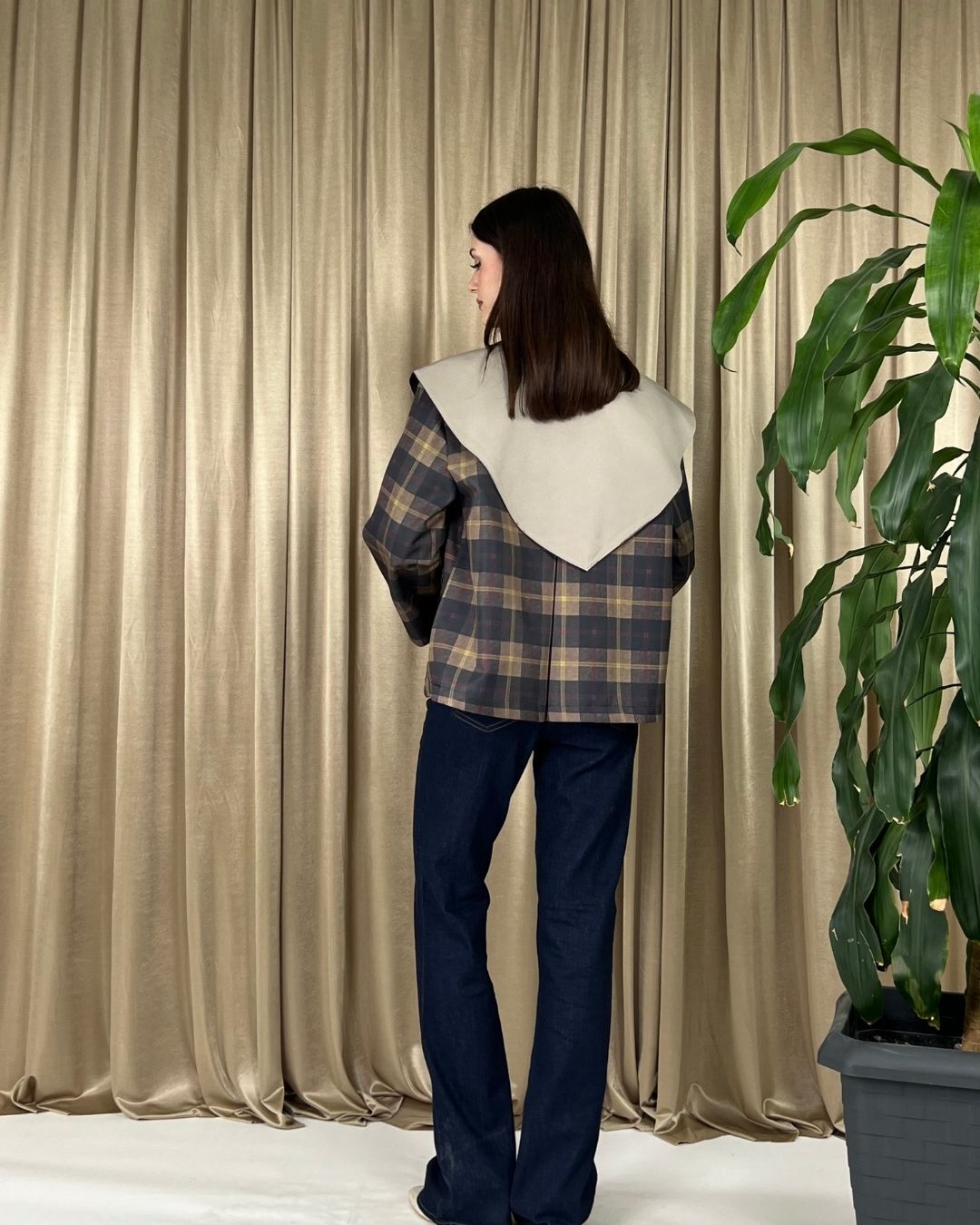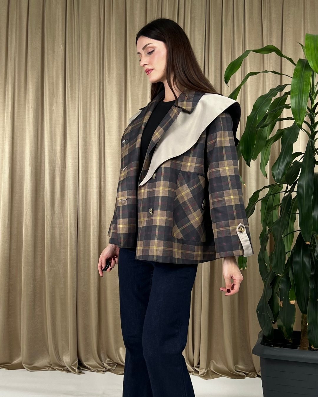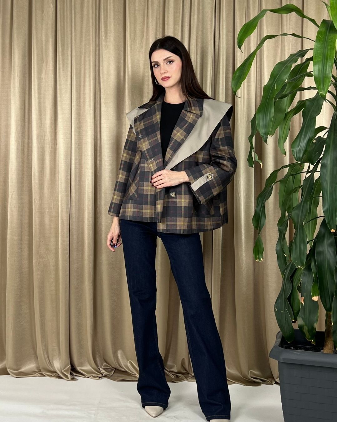 Klasik kareli deseni modern detaylarla buluşturan bu kadın oversize ceket, kontrast renkteki geniş yaka tasarımıyla dikkat çeker.