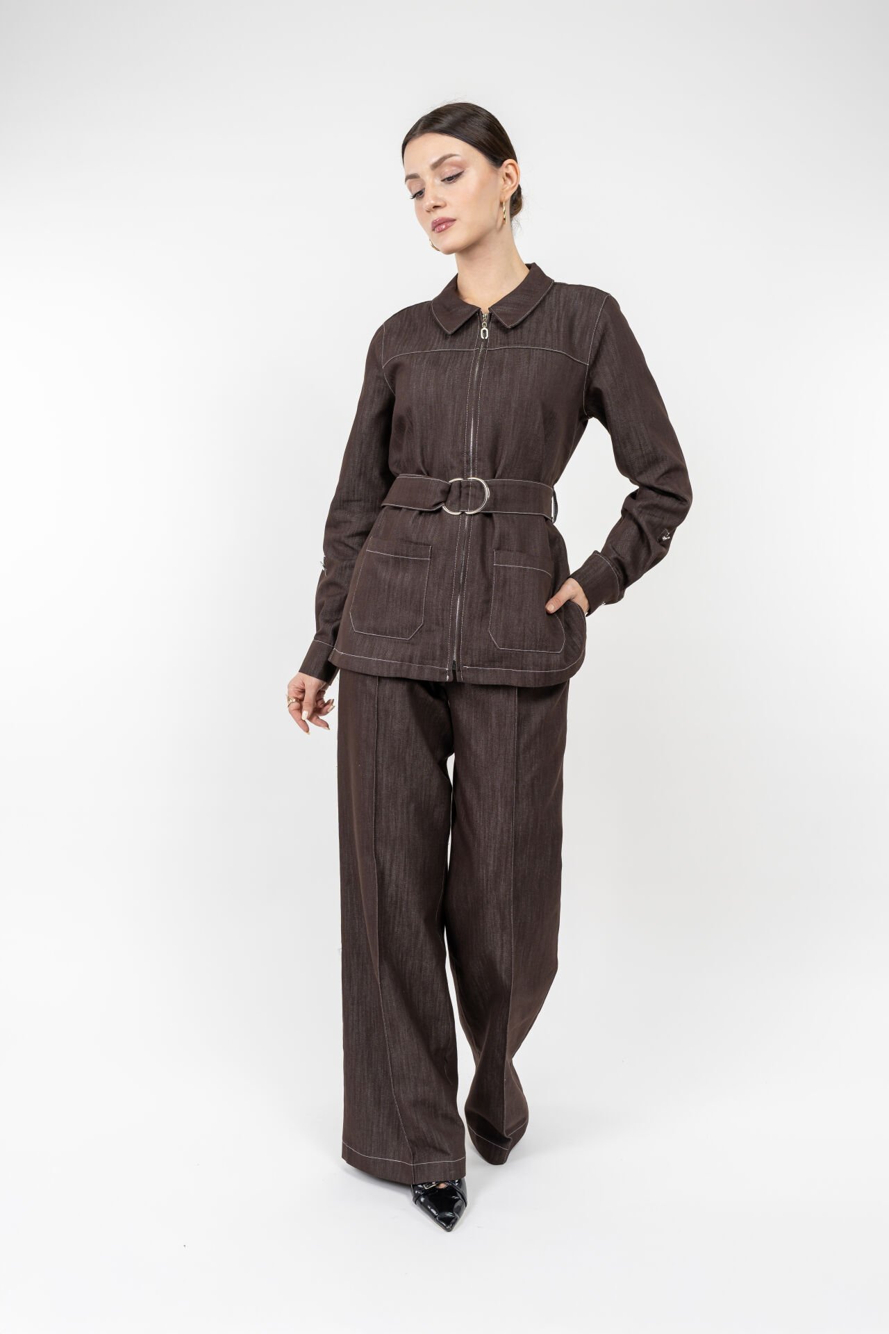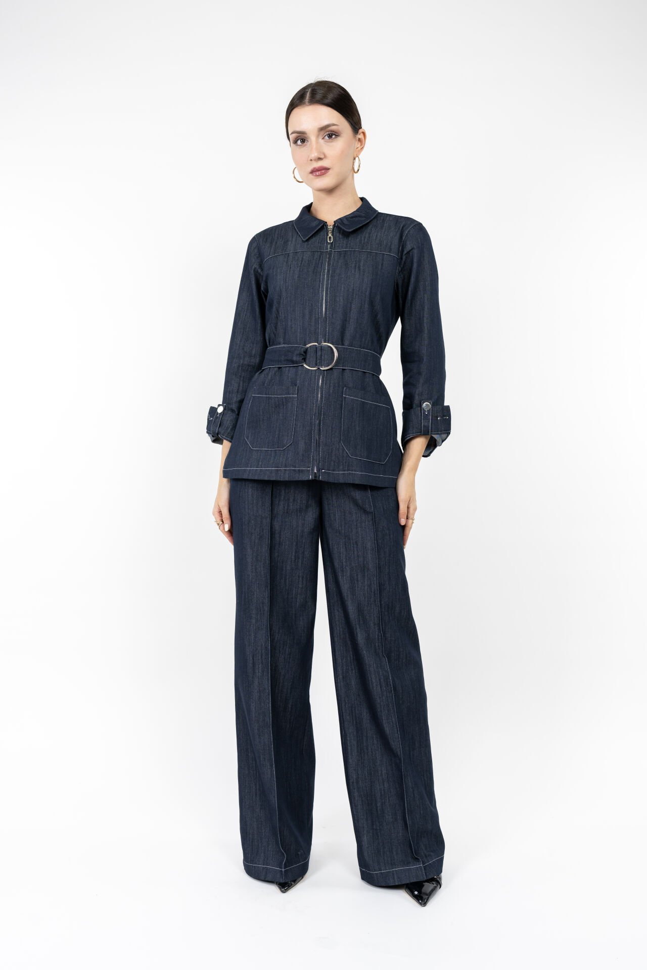 Fermuarlı önü ve D tokalı kemer detayı, bele oturarak vücudu kusursuz biçimde şekillendirir. Geniş paçalı pantolonuyla rahat bir kullanım sunarken, tok denim kumaşıyla formunu korur.