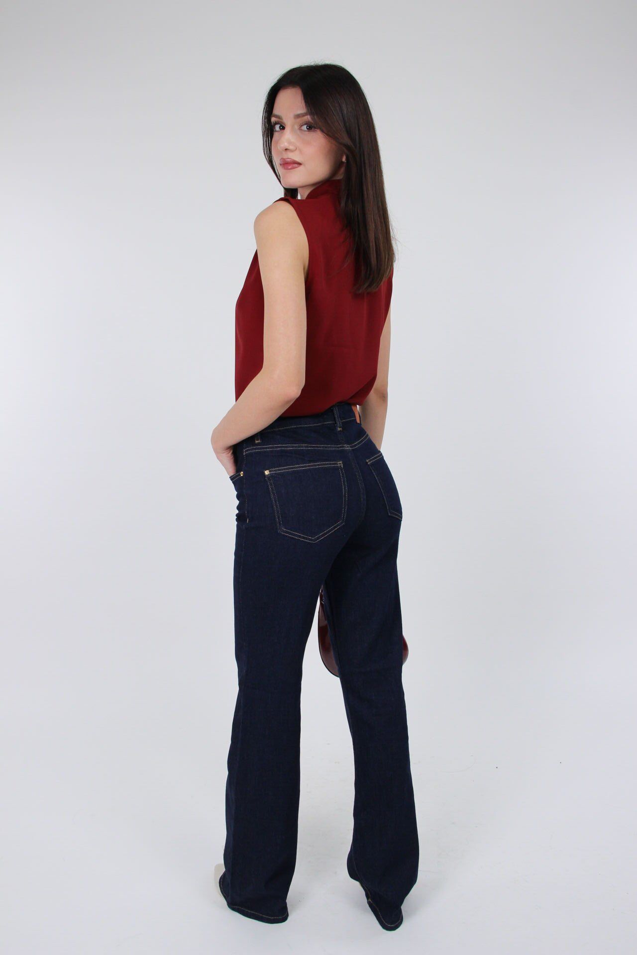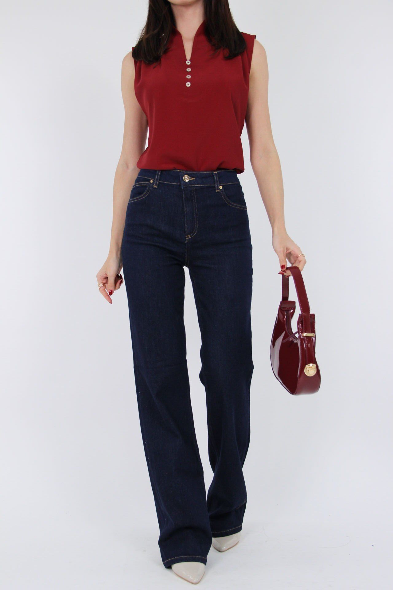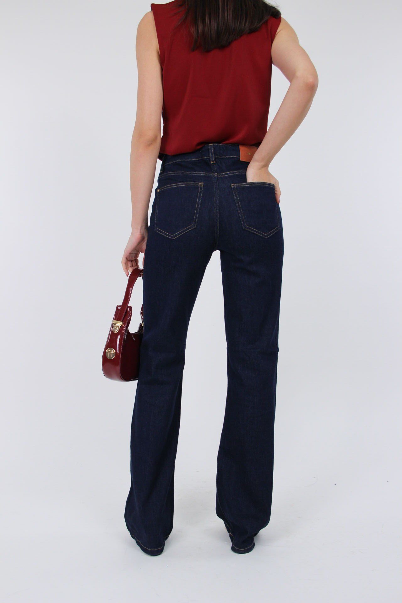Bu lacivert yüksek bel pantolon, düz kesimiyle rahatlığı ve şıklığı bir arada sunar.