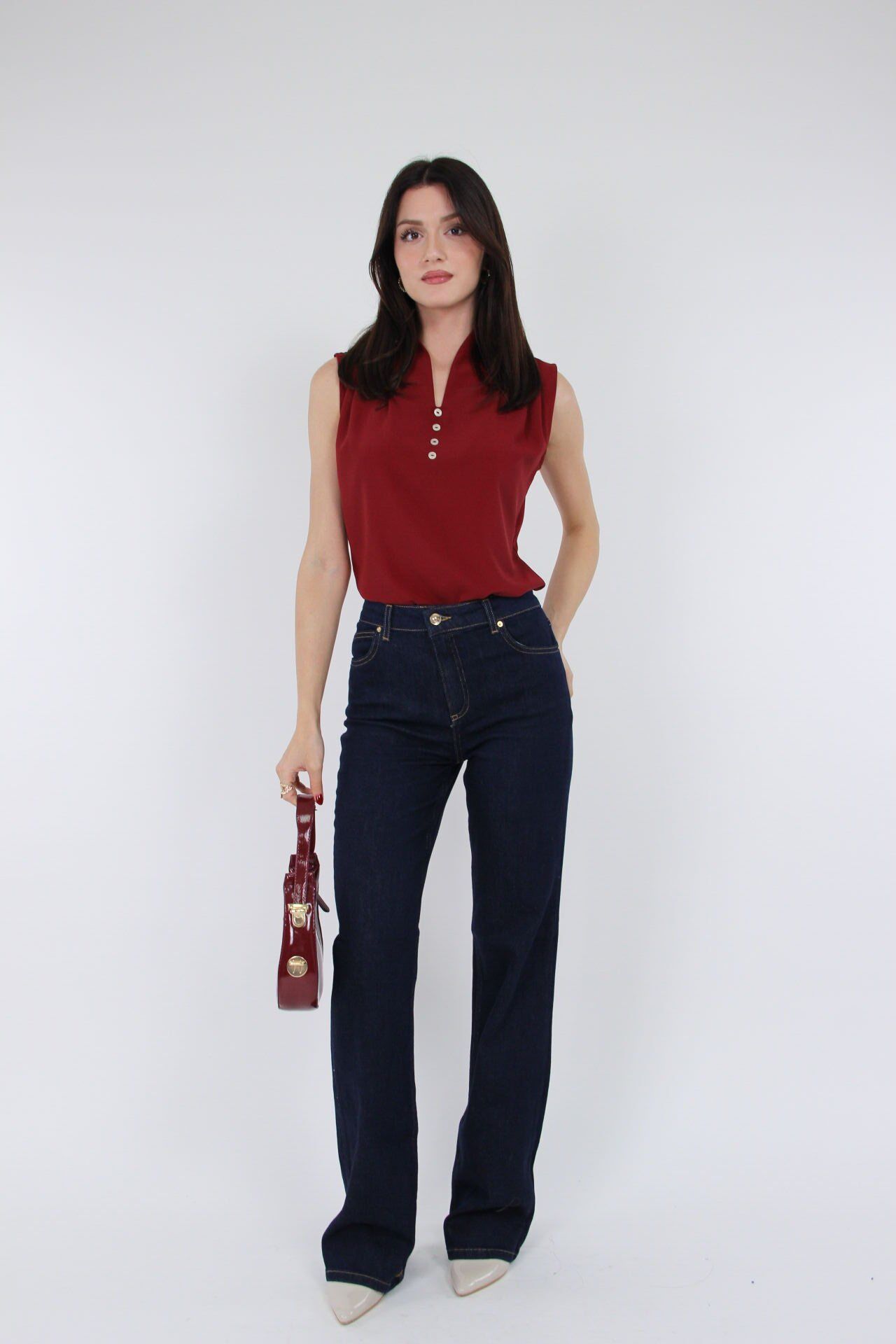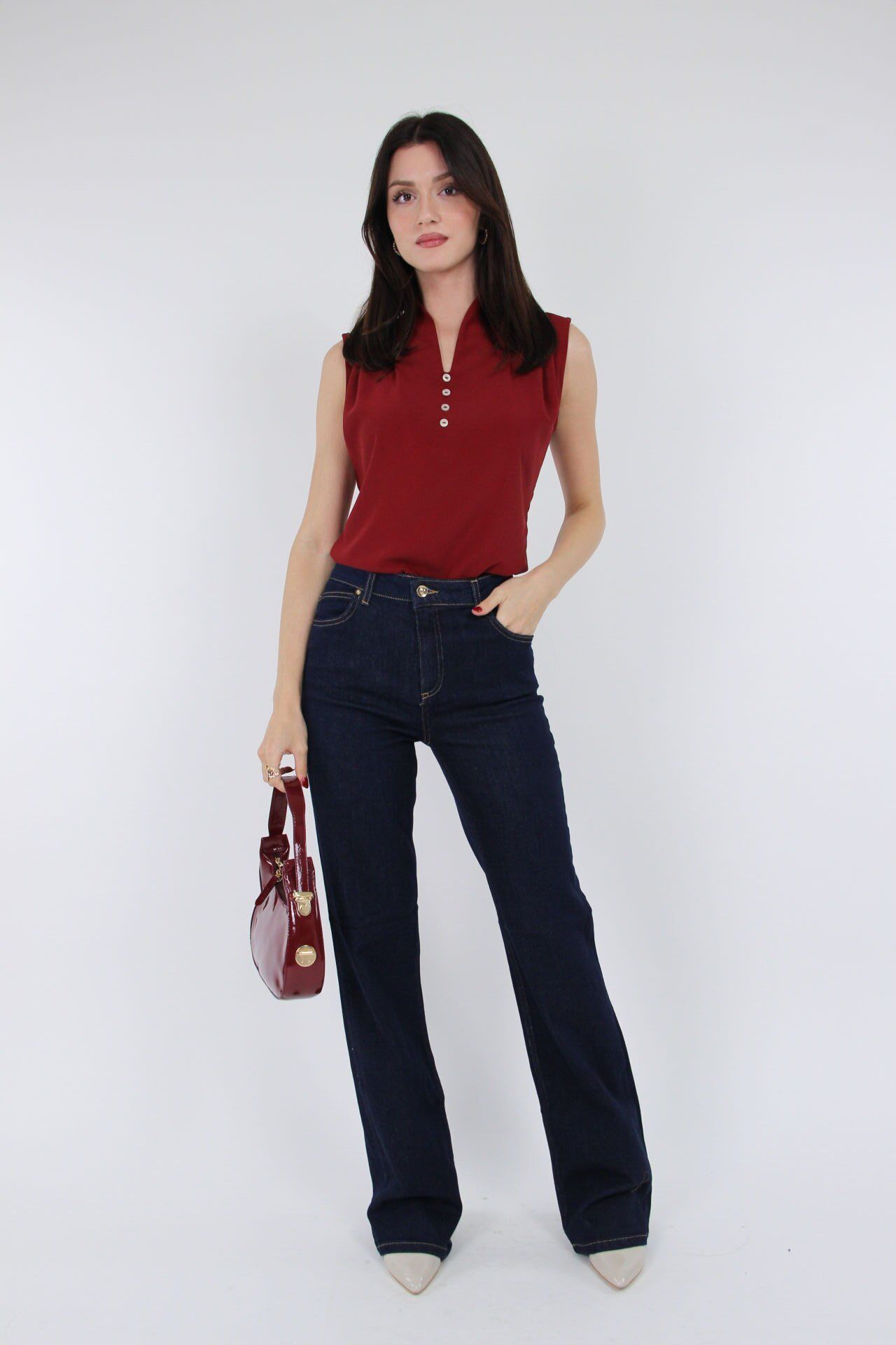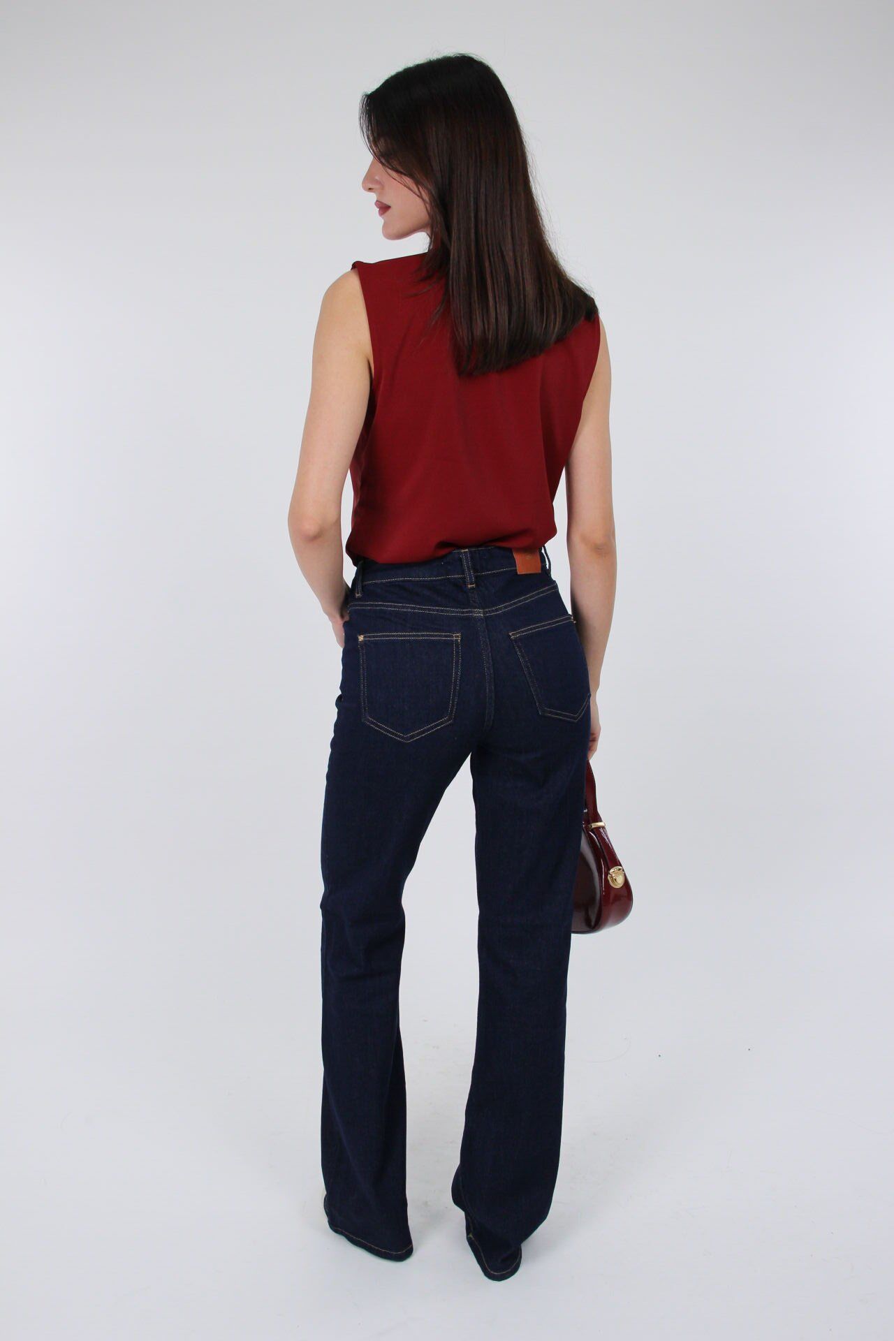 Bu lacivert yüksek bel pantolon, düz kesimiyle rahatlığı ve şıklığı bir arada sunar.