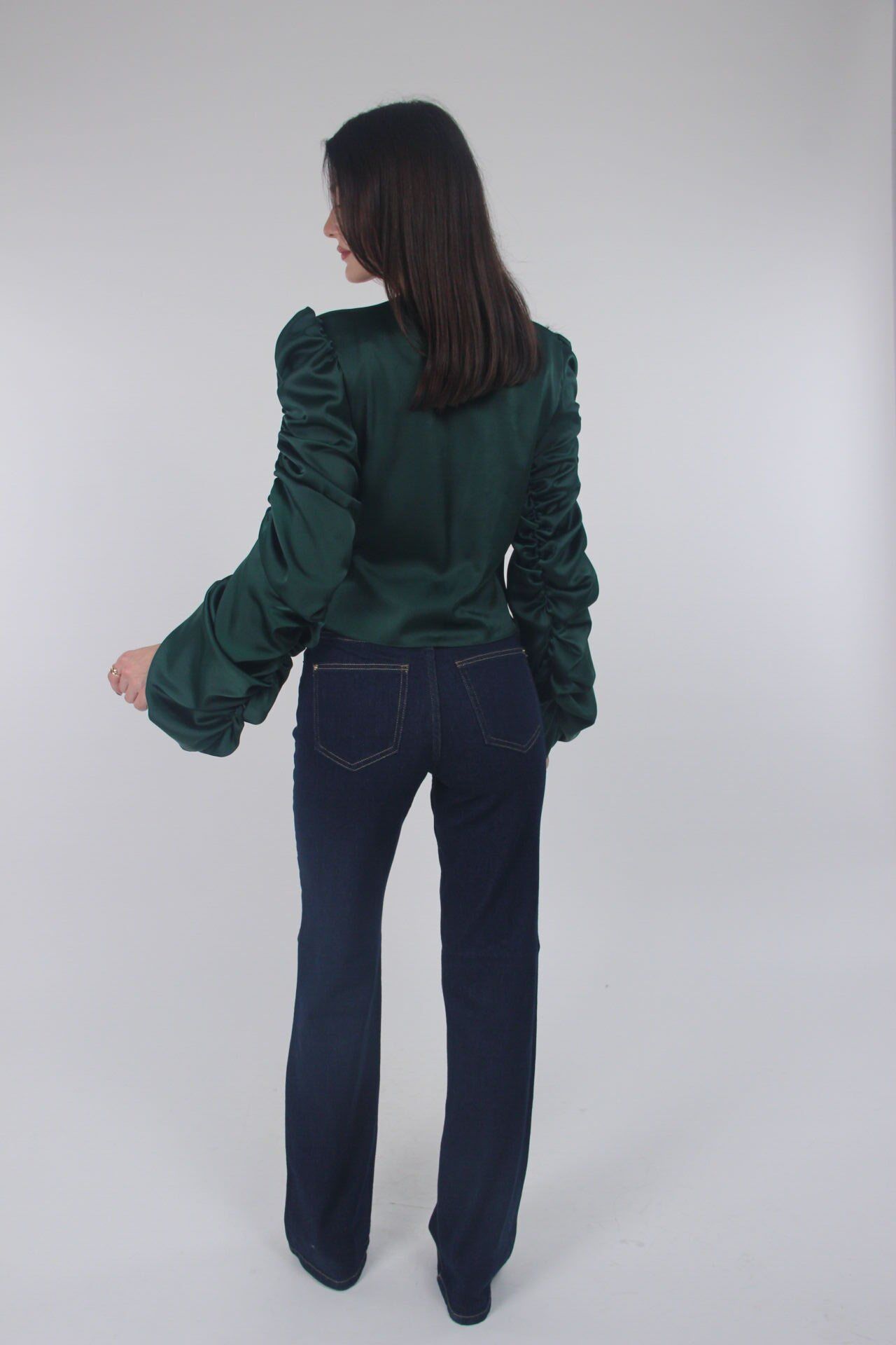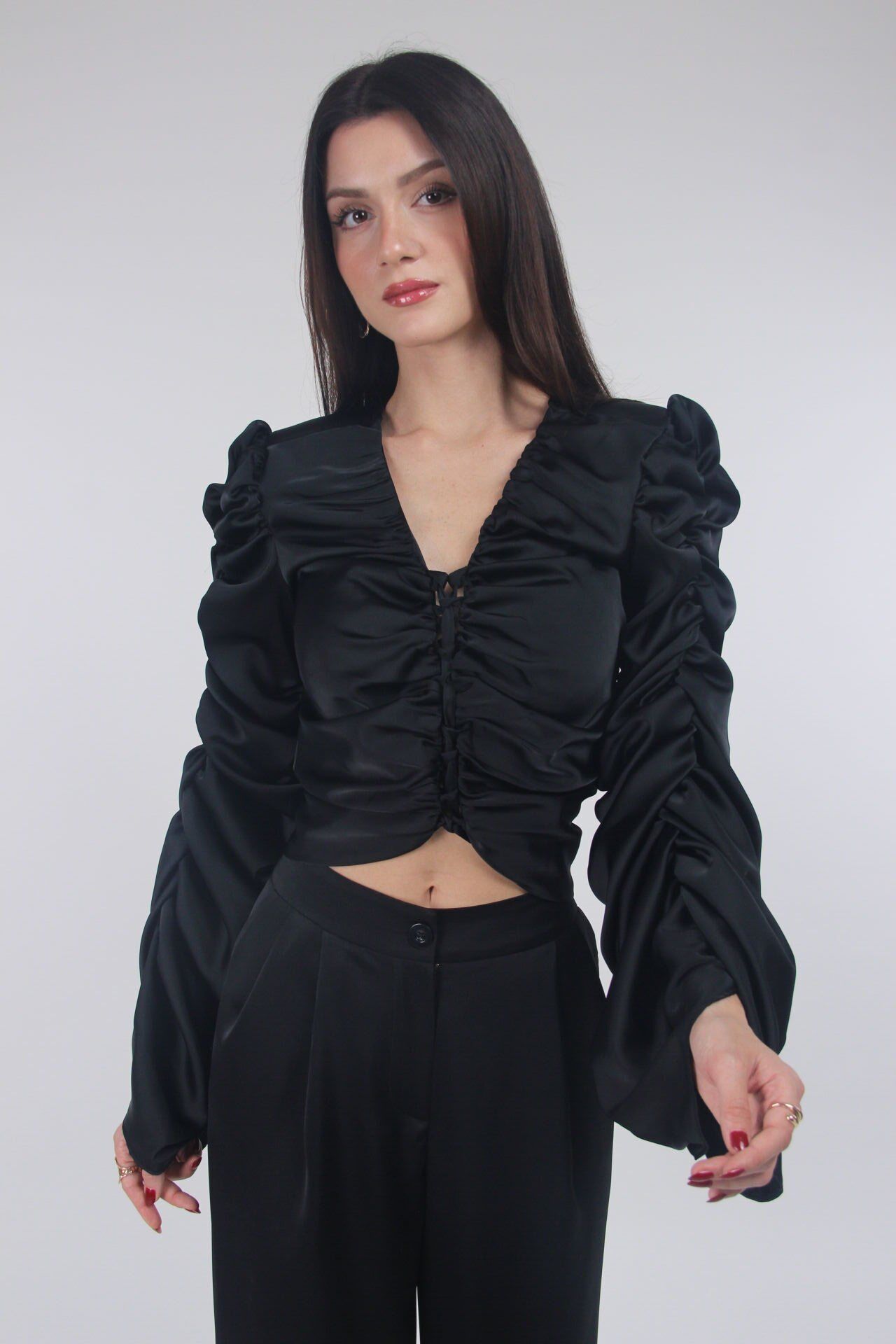 Işıltılı ve iddialı duruşuyla dikkat çeken bu siyah saten crop bluz, özel günlerde ve gece kombinlerinde zarif bir görünüm sunar.