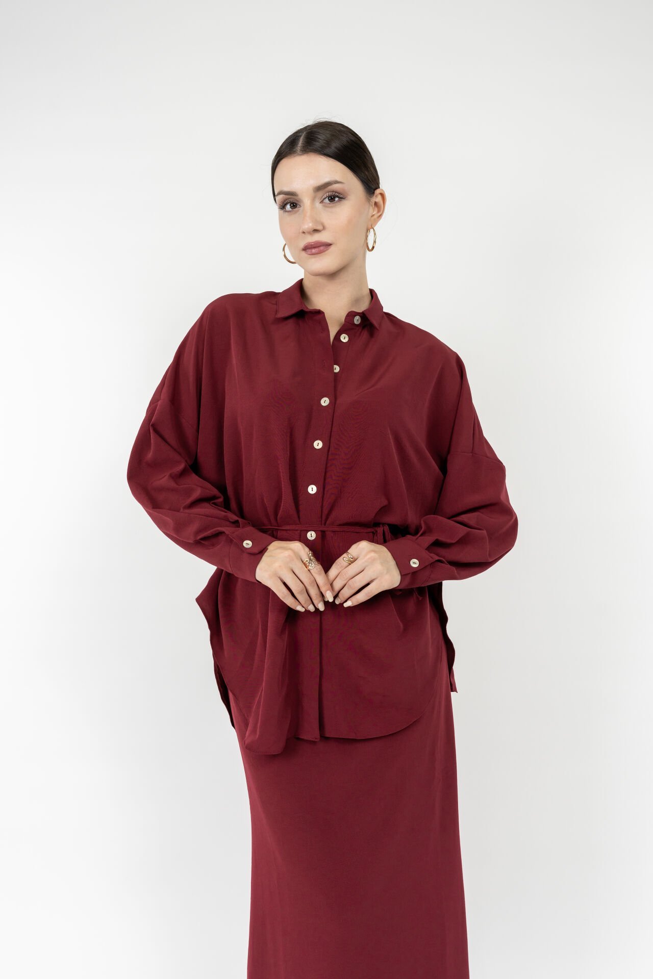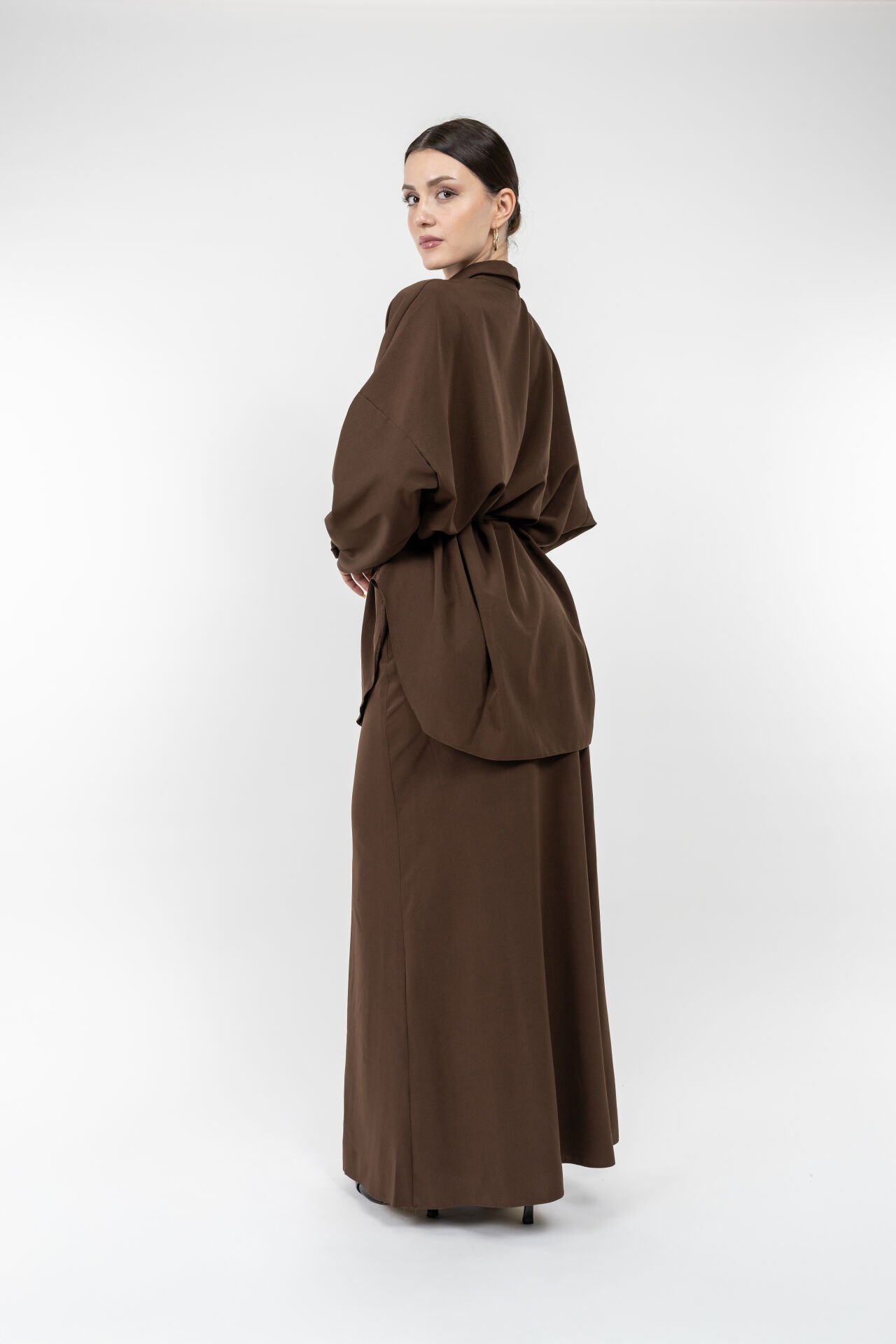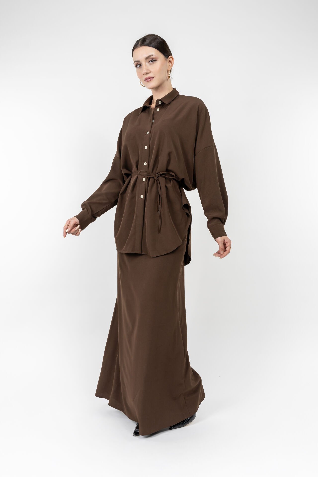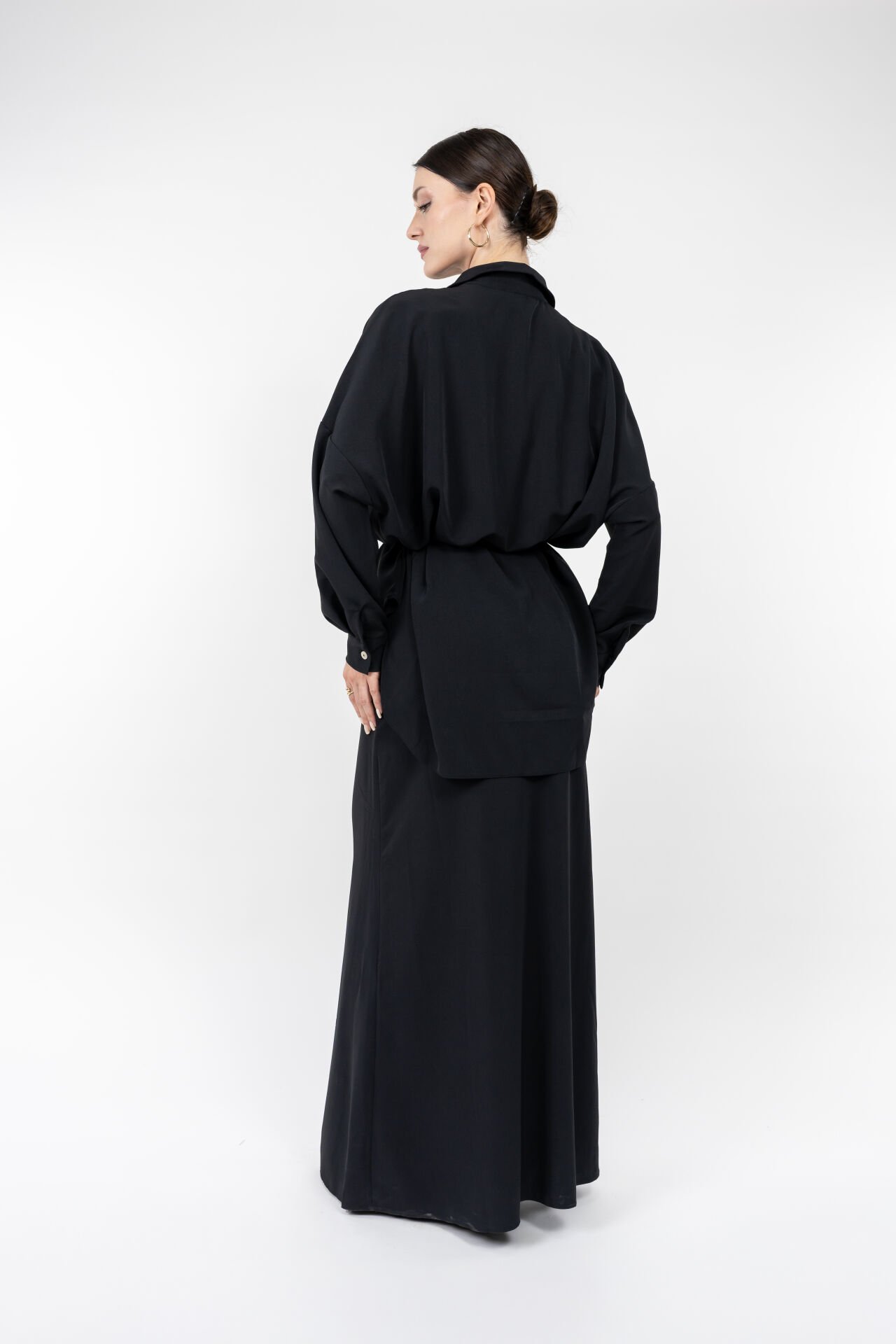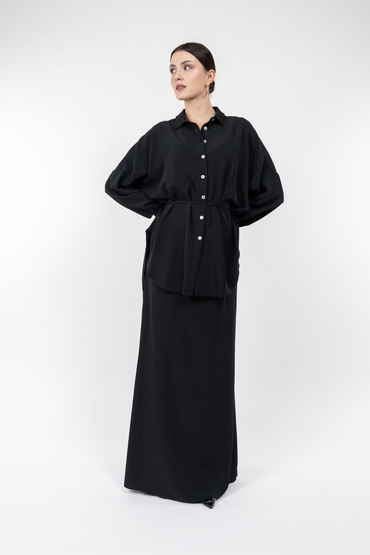 Bu kadın siyah uzun etekli takım, dökümlü kumaşı ve düğmeli gömlek tasarımıyla zarif bir siluet oluşturur.