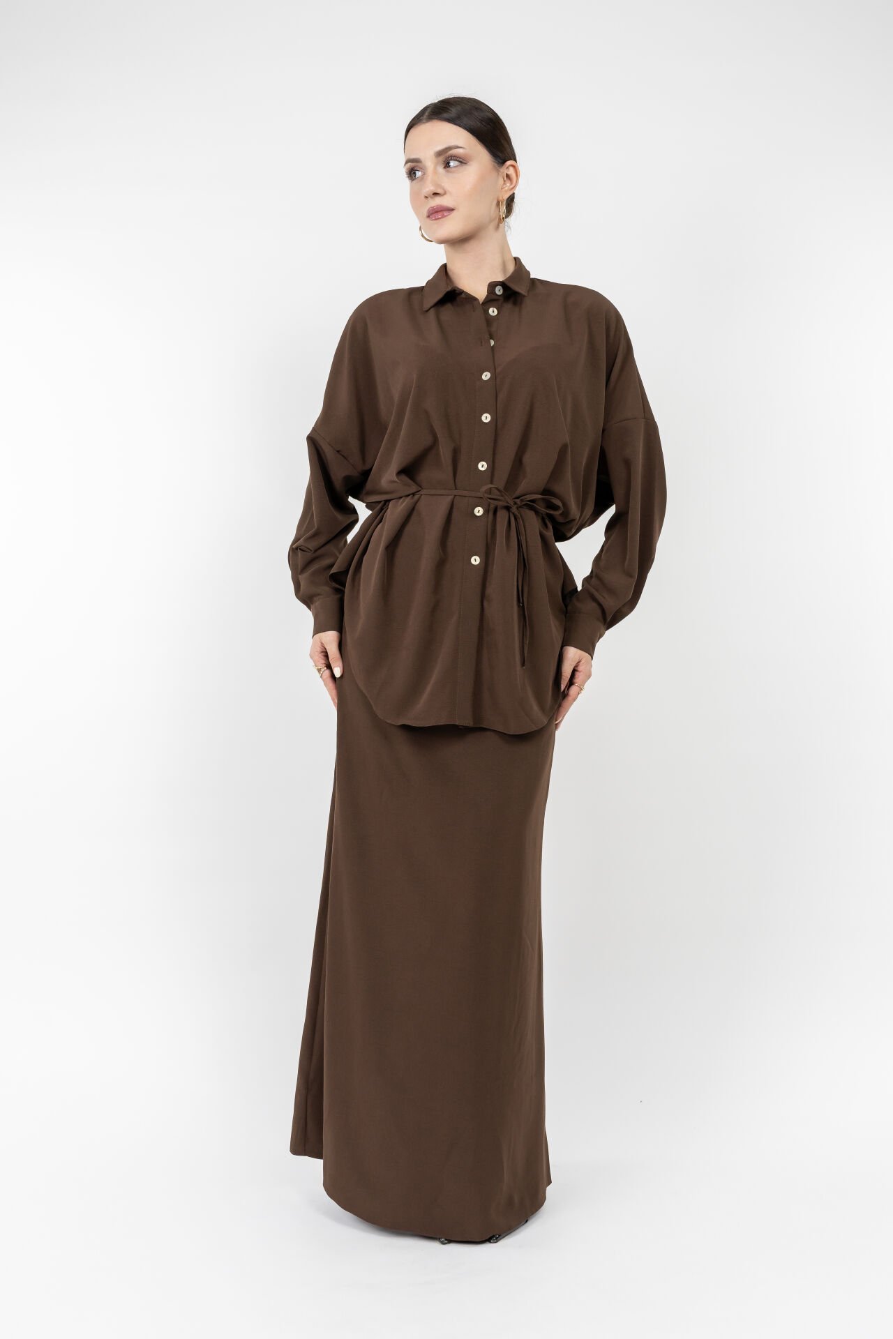 Bel kısmındaki bağlama detayı vücut formunu nazikçe vurgularken, uzun düz kesim eteği modern ve konforlu bir görünüm sunar.