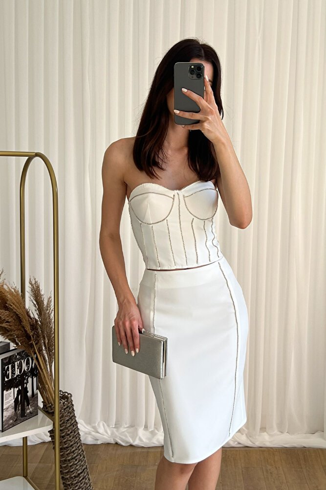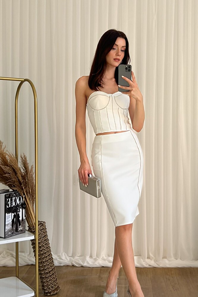 Korse görünümlü straplez bluzu ve uyumlu midi etek tasarımıyla feminen ve iddialı bir stil sunan bu ikili takım, davet ve özel gün kombinleri için şıklığı ön plana çıkarır.; Vücuda oturan dar kesimi zarif bir siluet oluştururken, astarlı yapısı gün boyu konfor sağlar.; Gizli fermuar detayı ile pratik kullanım sunan takım, modern ve şık görünümüyle özel organizasyonlarda stilinizi tamamlayan ideal bir tercihtir.;