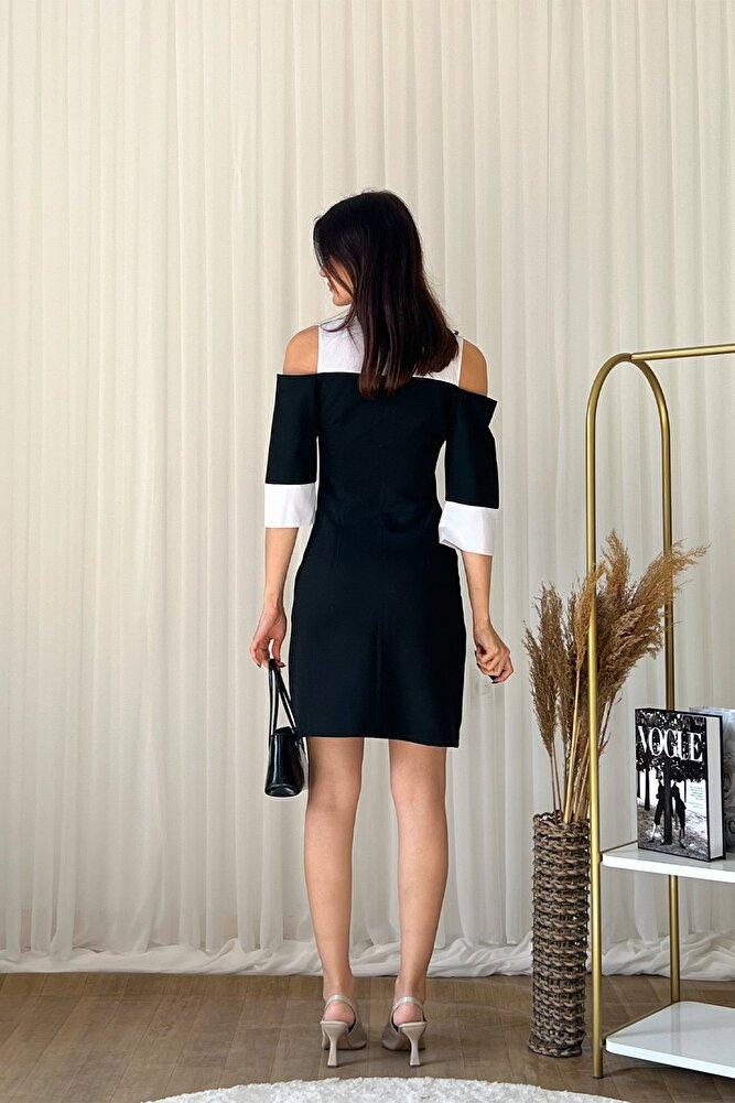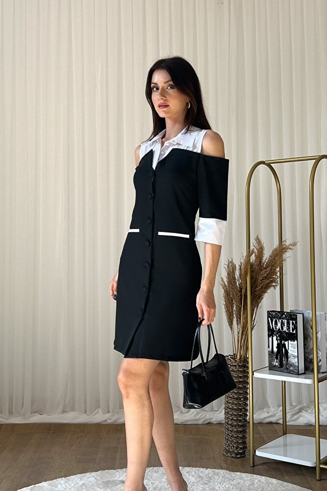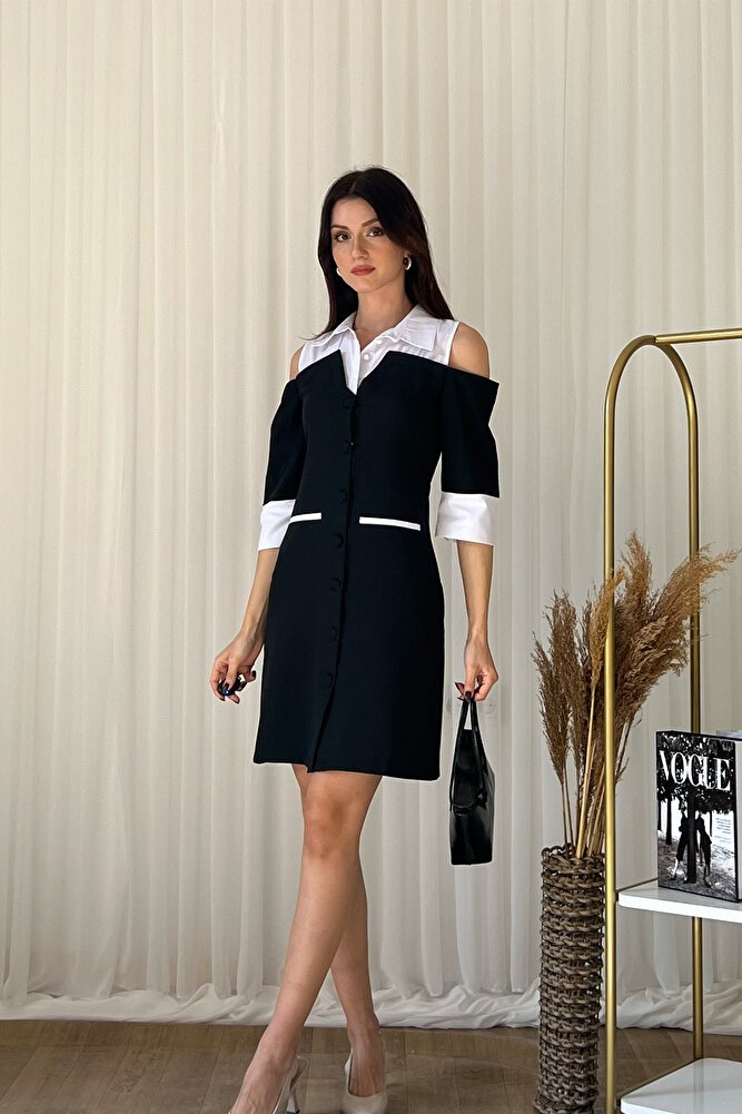 Omuz dekolteli tasarımı ve gömlek yaka detayıyla modern bir şıklık sunan bu mini boy elbise, dar kesimi sayesinde vücuda oturarak zarif bir siluet oluşturur.; Ön düğme kapaması elbiseye klasik bir dokunuş katarken, uzun kollu yapısı ile ofis kombinlerinden şehir şıklığına kadar geniş bir kullanım alanı sunar.; Hafif ve rahat kumaş yapısı gün boyu konfor sağlarken, zamansız tasarımıyla gardırobunuzun kurtarıcı parçalarından biri olmaya adaydır.;