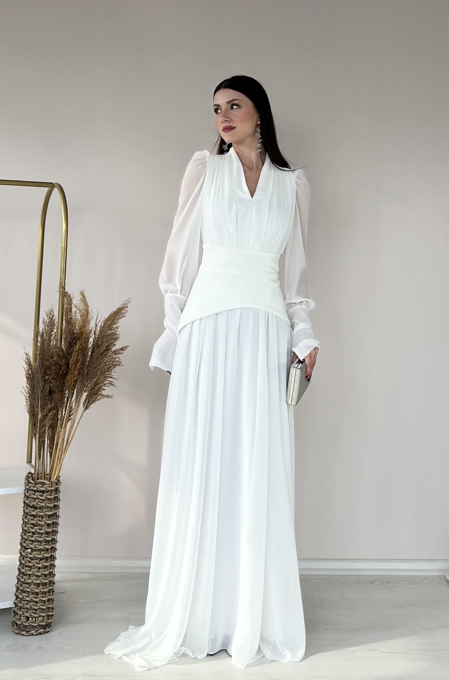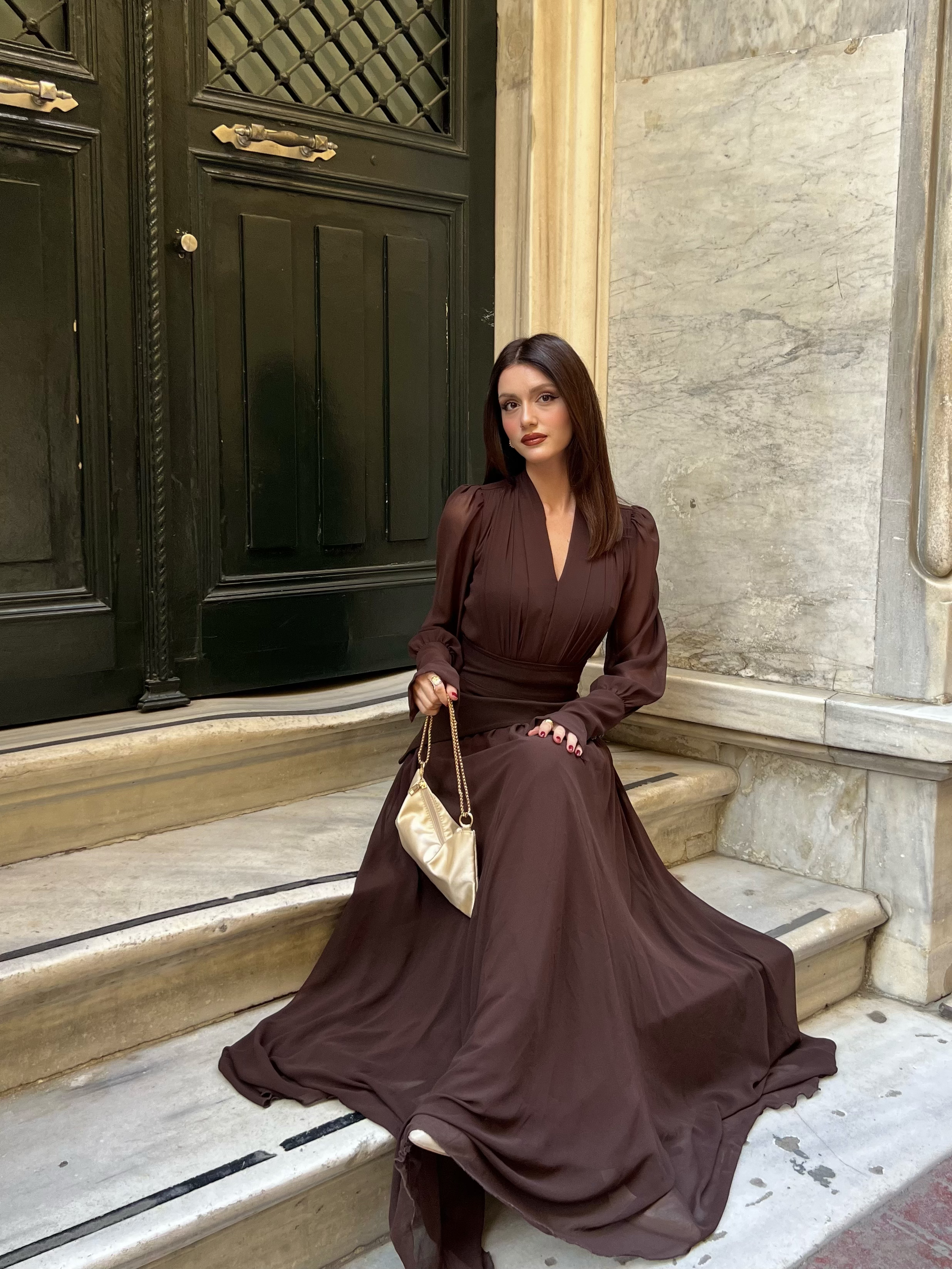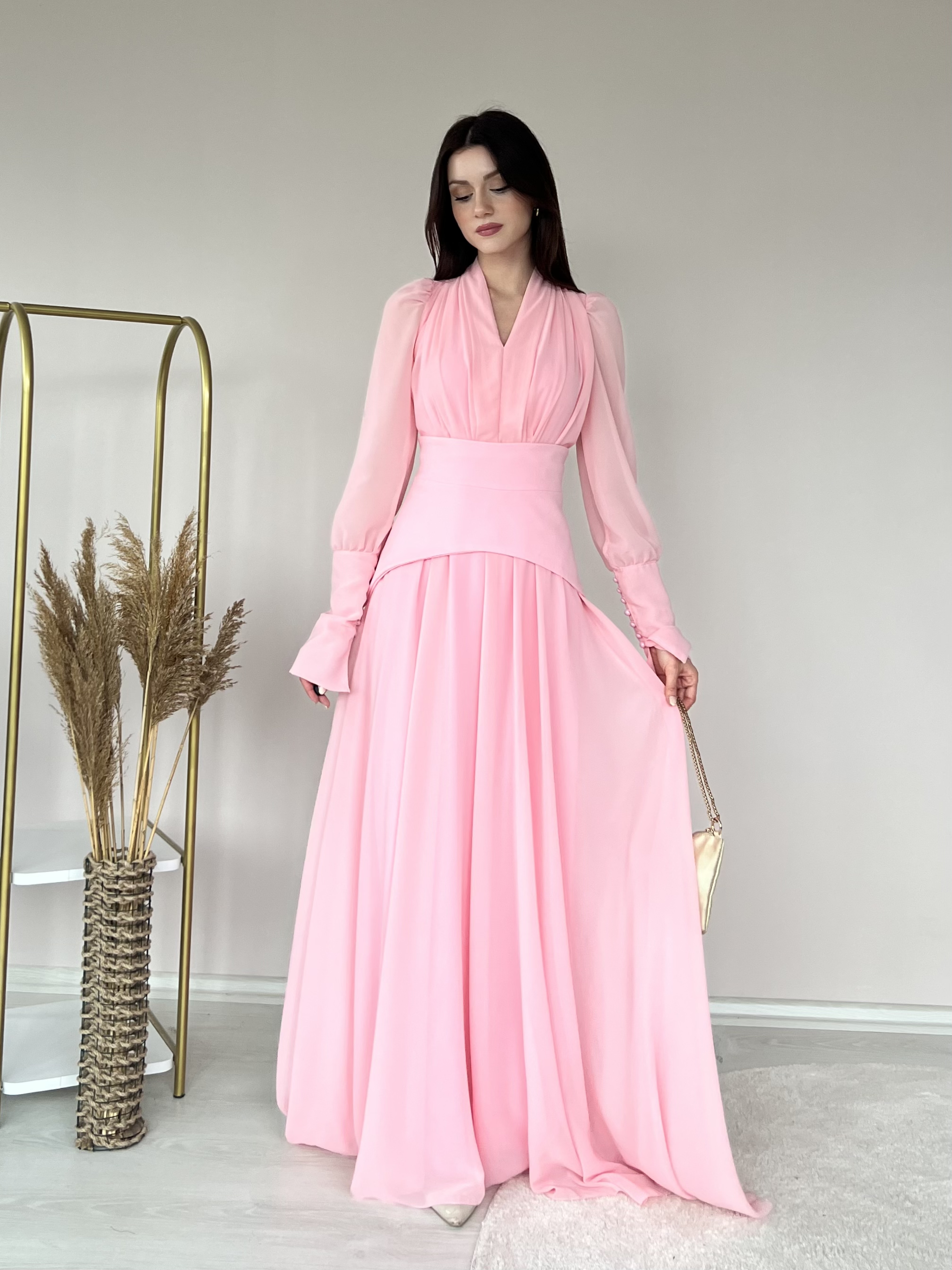 Hafif ve akıcı şifon kumaşıyla zarif bir duruş sunar.